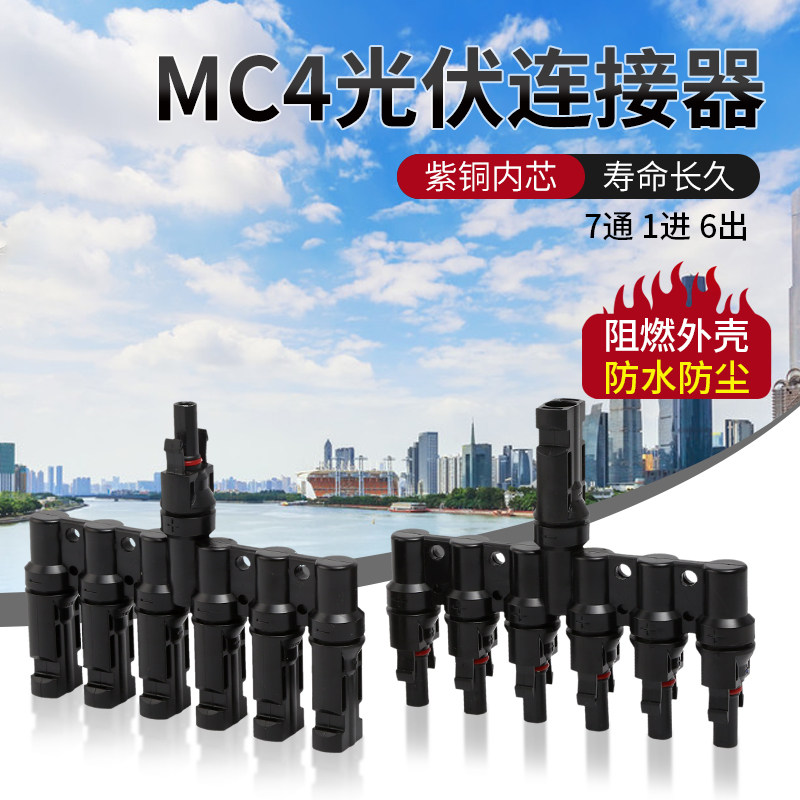 T型七通光伏连接器一拖六太阳能发电D系统MC4公母接头紫铜镀锡端