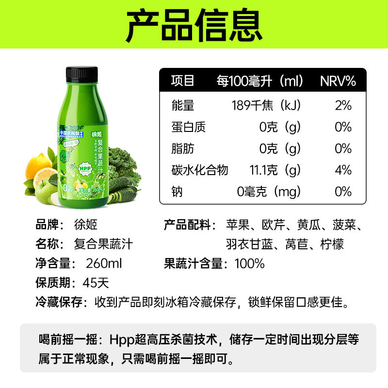 推荐理由:中国农科院蔬菜所徐姬HPP100%纯鲜榨果蔬汁饮料羽衣甘蓝汁蔬菜汁