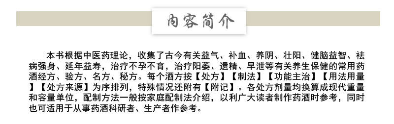 推荐理由:养生保健用药酒中国药酒泡药酒配方中药泡制配方益气补血养阴健脑益智祛病强身延年益寿养生保健药酒古方经验名秘方配制法功能主治