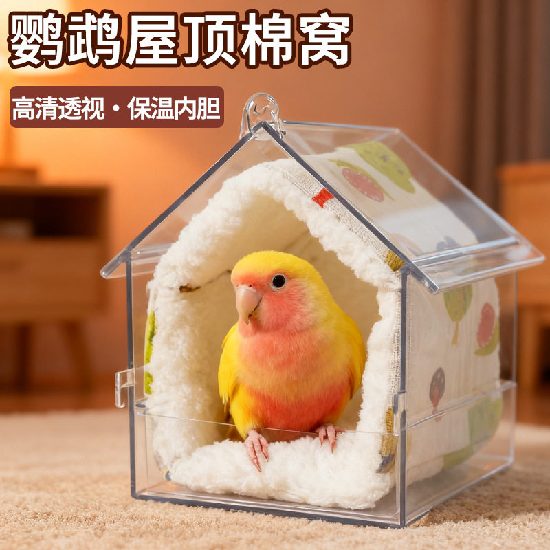 鹦鹉保暖喂食器屋顶洗澡盆带棉垫鸟用别墅透明喂水喂食盒