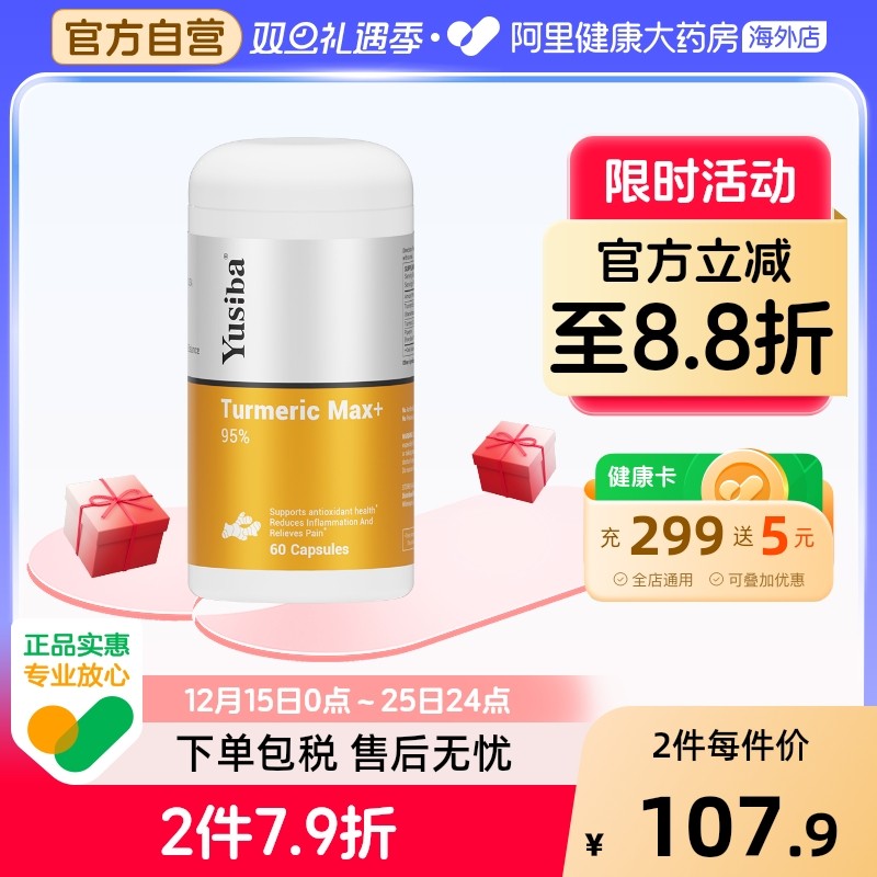 Yusiba姜黄素胶囊美国进口抗炎内服补剂健身抗氧化黑胡椒进口姜黄