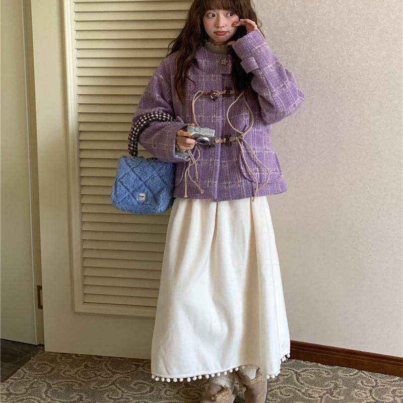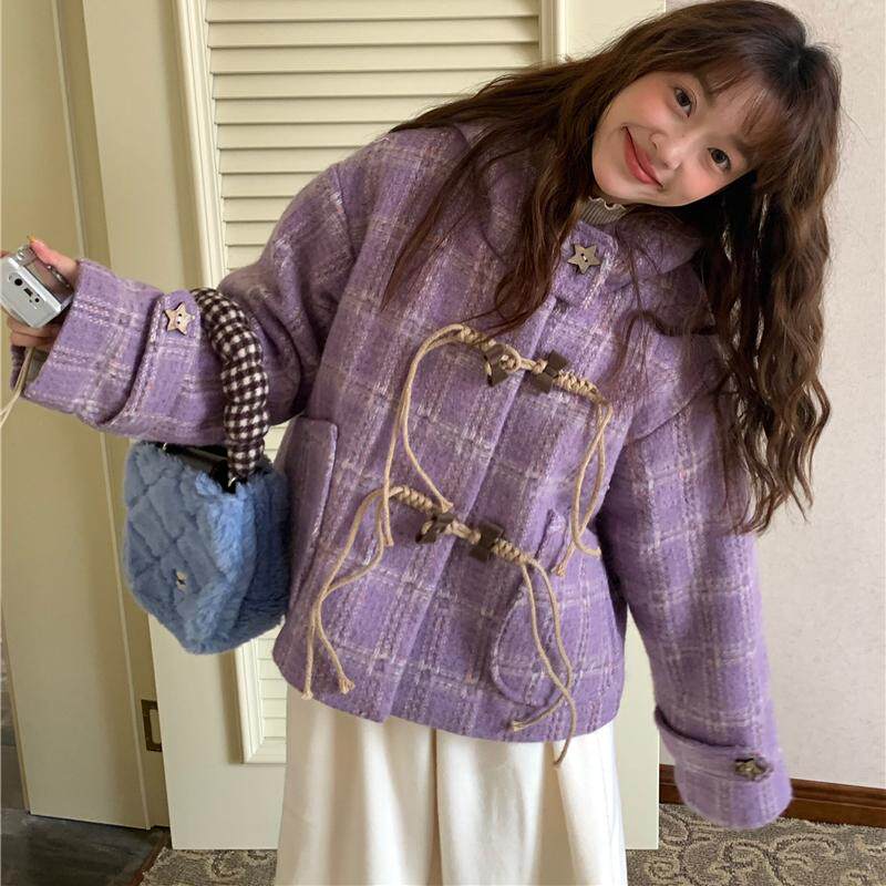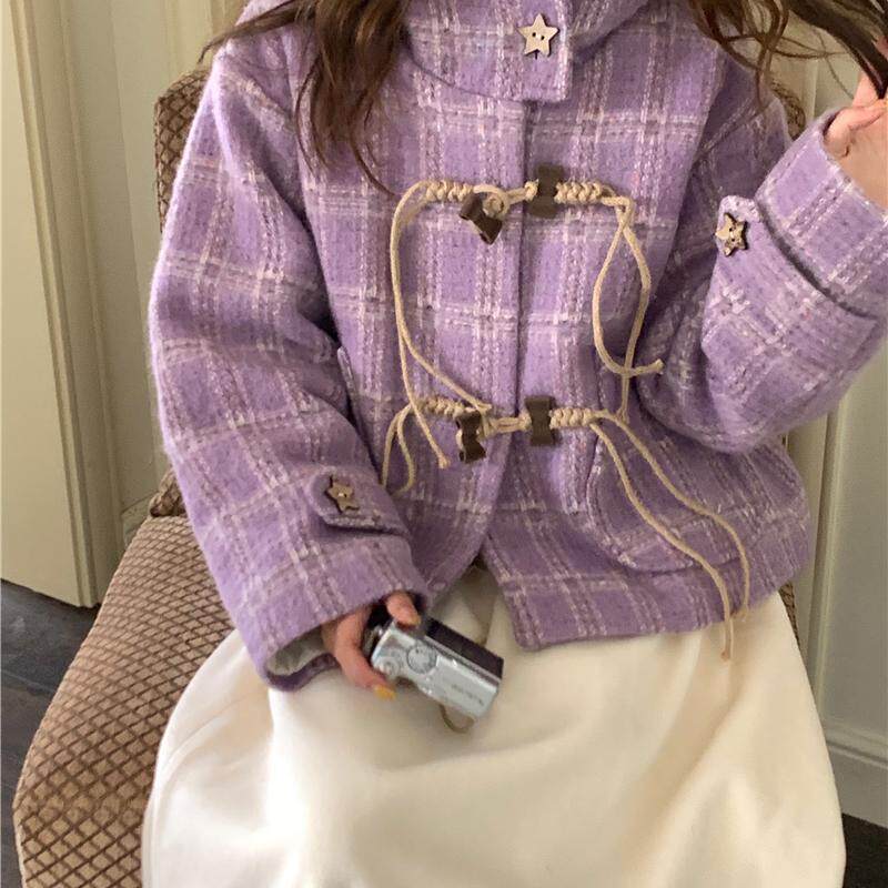 推荐理由:格纹连帽牛角扣毛呢外套女2025冬季新款韩系学院风小个子呢子大衣