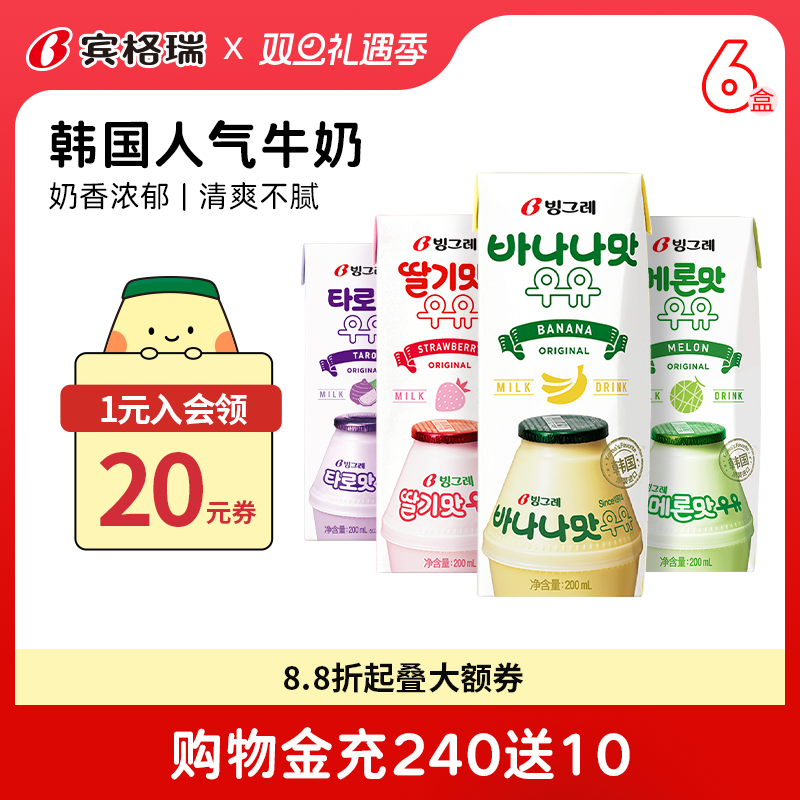 韩国进口宾格瑞水果牛奶12盒香蕉草莓哈密瓜牛奶早餐调味乳儿童奶