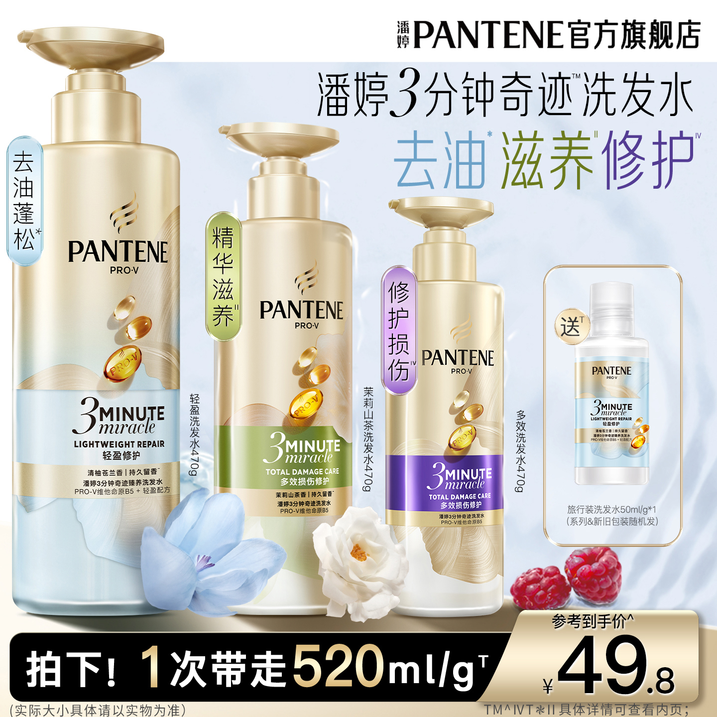 潘婷三分钟奇迹茉莉山茶花苍兰香洗发水露洗头膏蓬松清爽修护干枯
