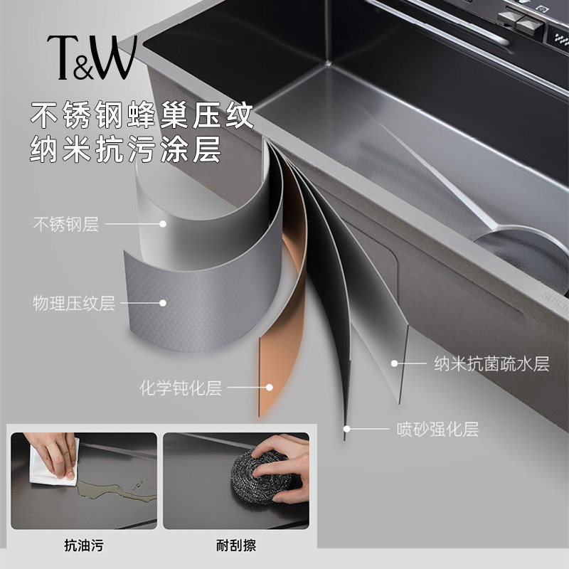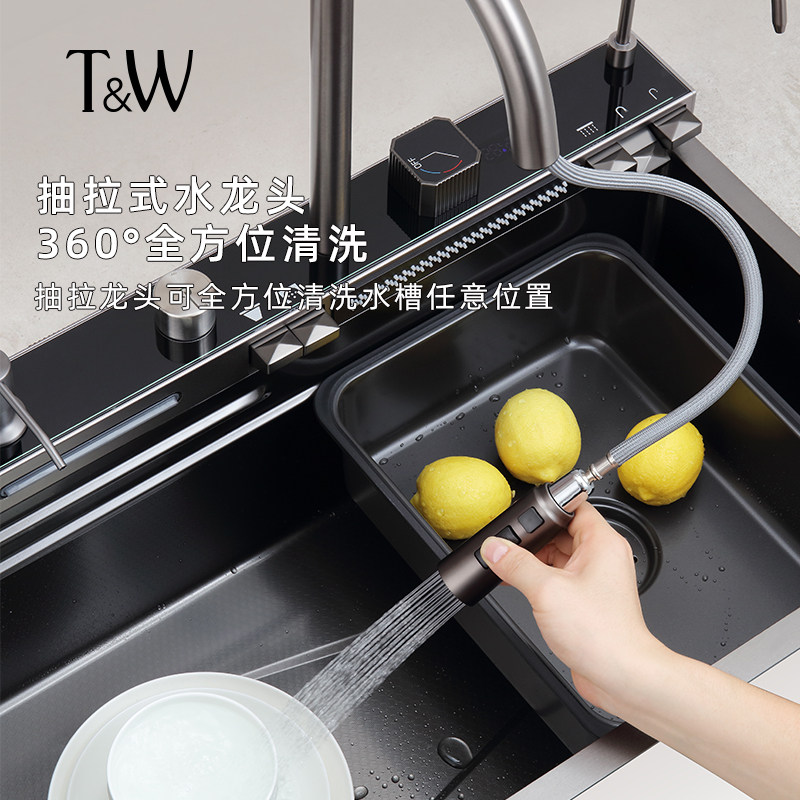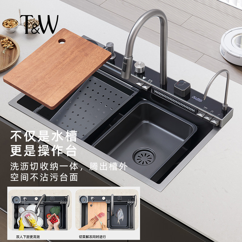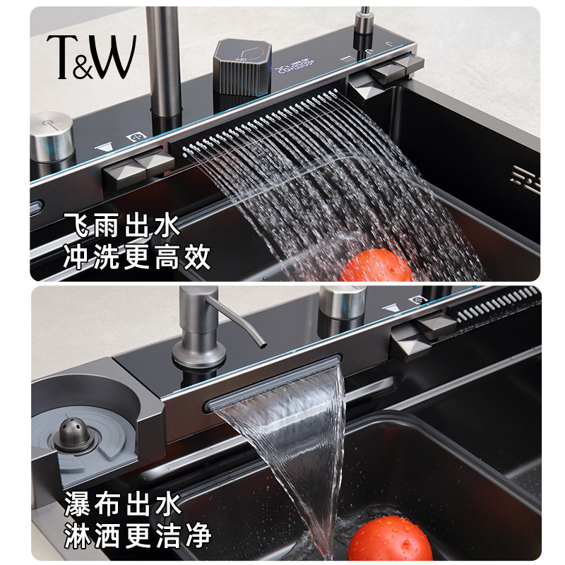 特拉维尔智能飞雨瀑布水槽304不锈钢厨房洗菜盆加厚洗菜碗池套装