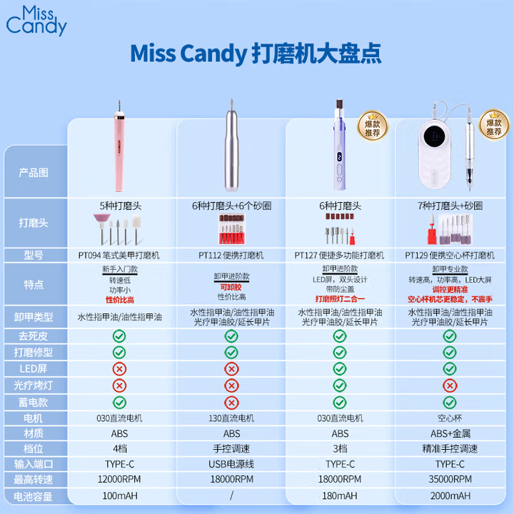 MissCandy卸甲打磨机美甲工具空心杯电动手持便携打磨笔修甲专用