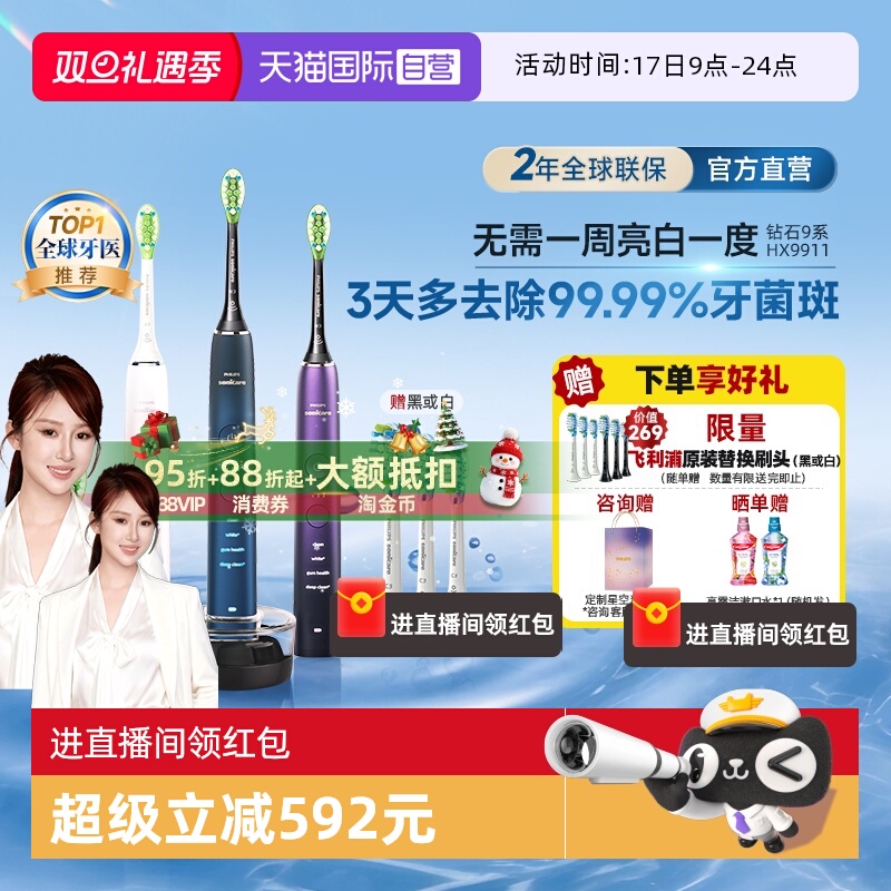 【自营】飞利浦电动牙刷钻石9系HX9911高端智能清洁可连蓝牙APP