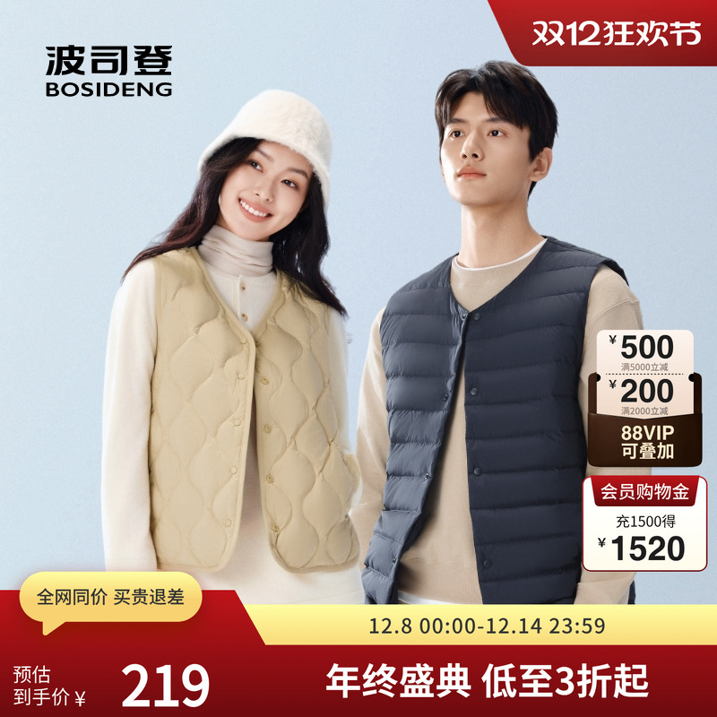 波司登秋季男女居家羽绒背心轻暖V领羽绒内胆休闲舒适显瘦马甲