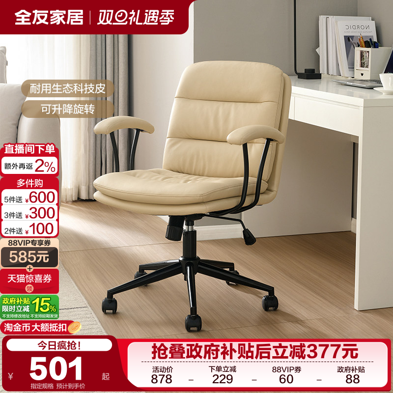 全友家居可升降旋转书椅书房电脑椅软包靠背万向滑轮办公椅家具
