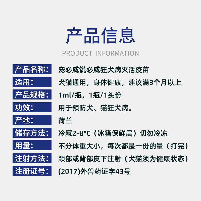 推荐理由:锐必威荷兰进口宠必威狂犬疫苗英特威猫咪宠物狗狗默沙东育苗防疫