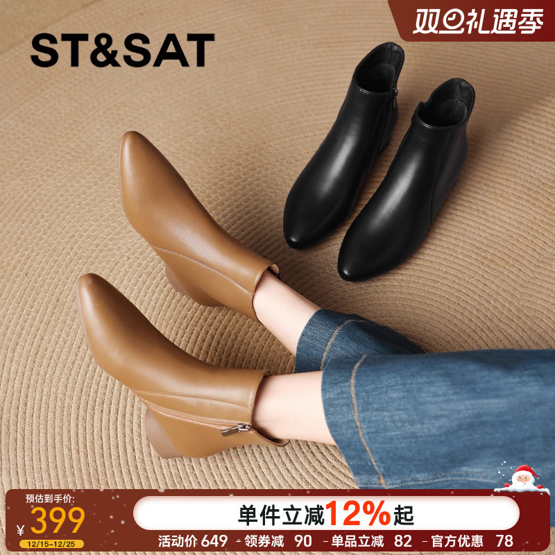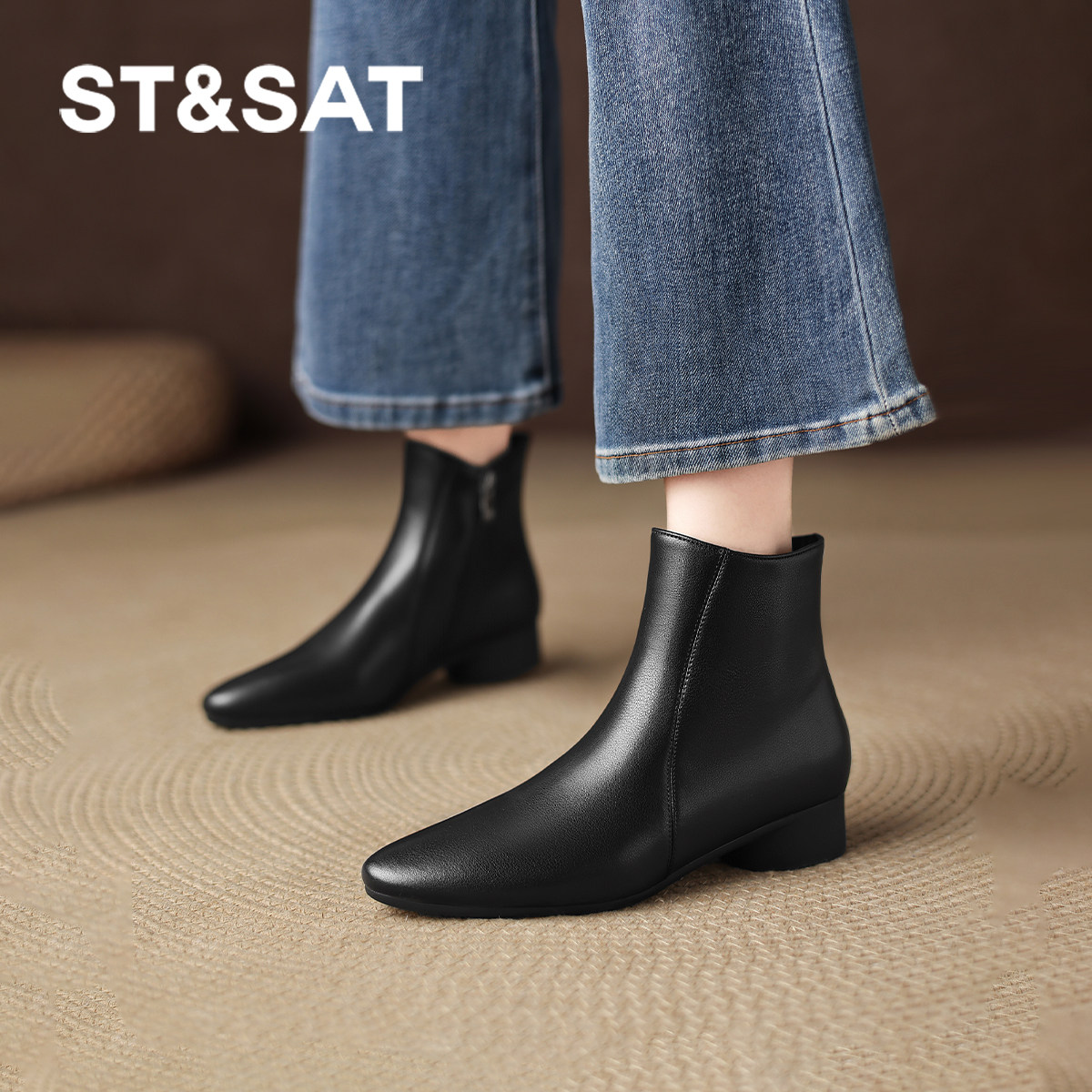 星期六尖头真皮黑色小短靴2025新款女款马丁女靴子皮靴秋冬及踝靴