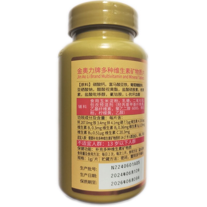 金奥力牌多种维生素矿物质片60片钙铁锌硒维生素AB1B2B6B12vc
