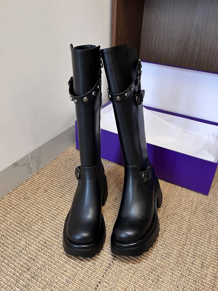 拖沓刘天王/小粗腿巨显瘦厚底粗高跟铆钉骑士靴/全牛皮/大小筒围
