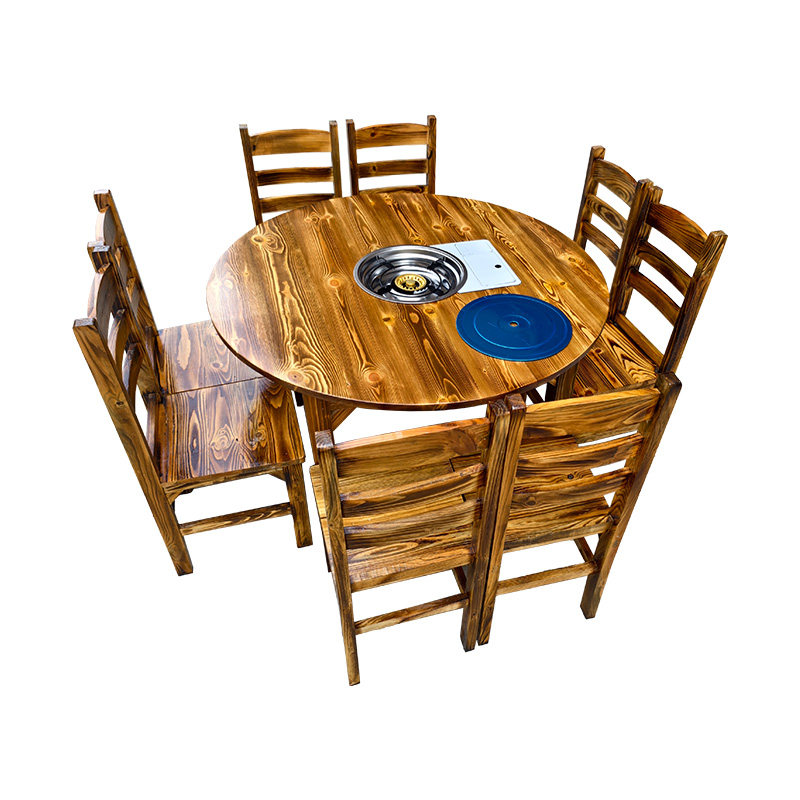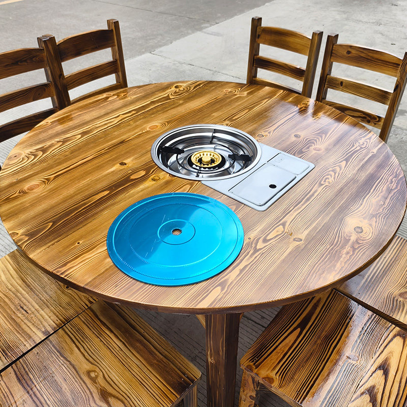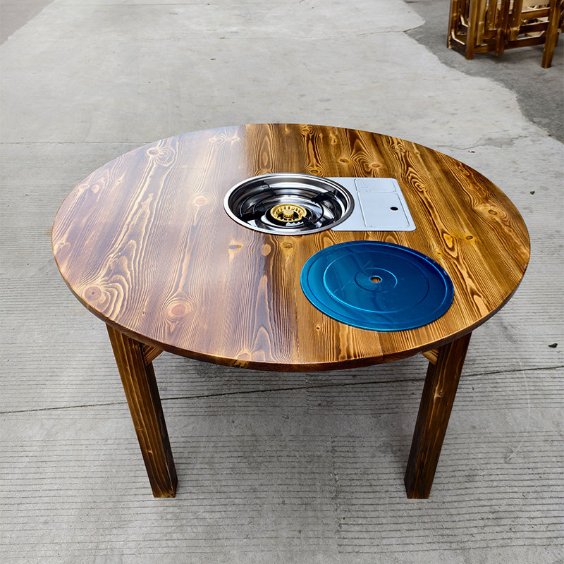 火锅桌实木圆桌嵌入式卡式炉火锅店烧烤桌子大排档地摊经济木桌椅