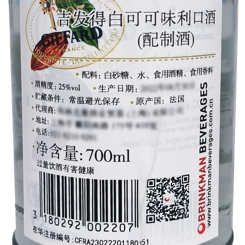 推荐理由:吉发得白可可味利口酒Giffard CremeCacao Liqueur70Cl 25度 国行