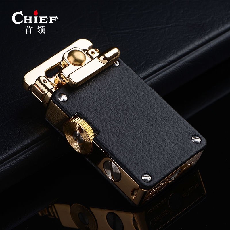 首领创意高档皮纹煤油打火机个性金属按压摇臂点火复古防风男士礼