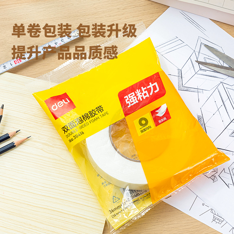 得力泡棉双面胶带泡棉胶墙面固定两面胶强力海绵双面胶高粘度加厚学生手工用办公用品单卷泡沫胶带办公批发