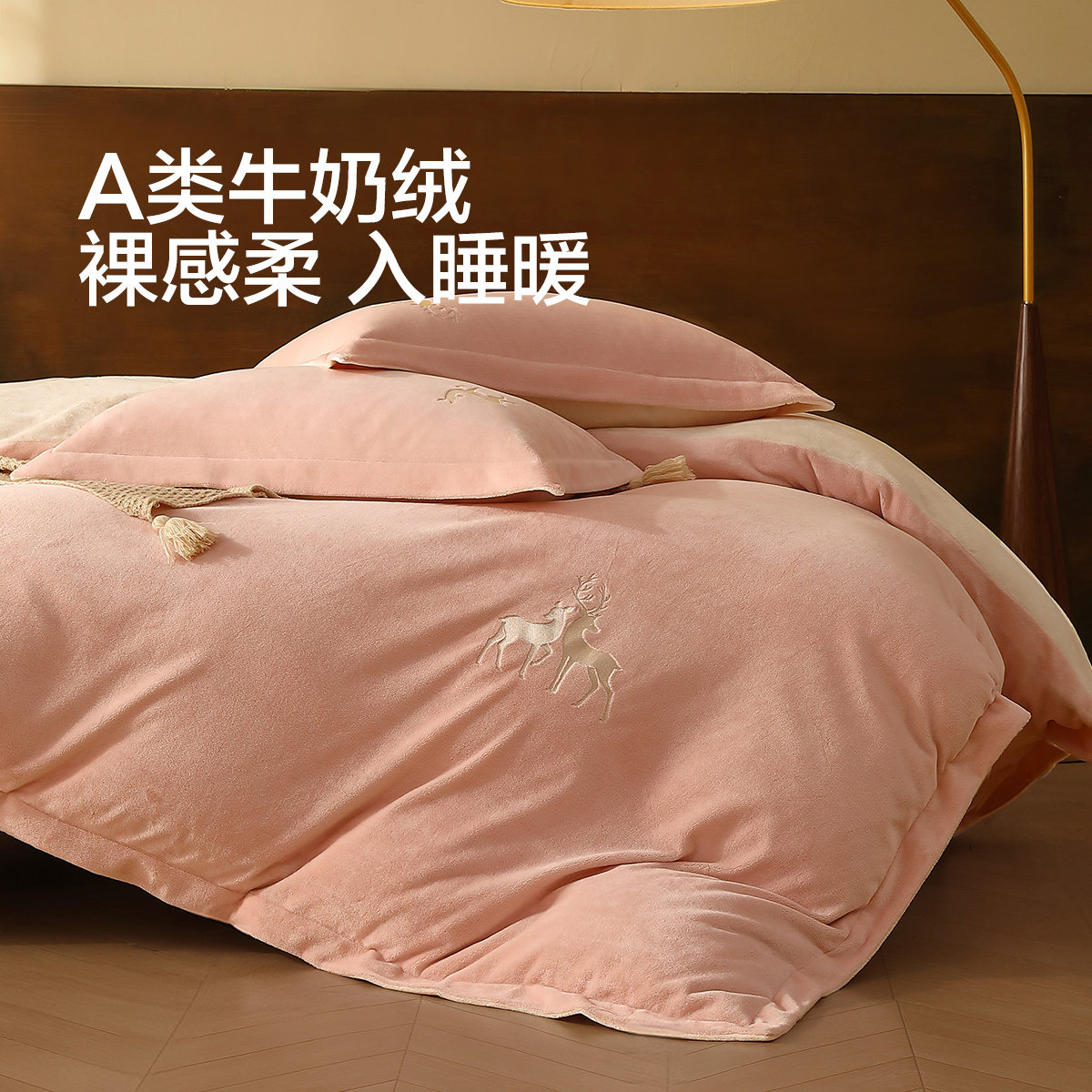 推荐理由:水星家纺牛奶绒四件套抗静电暖绒套件冬季保暖床单被子套简约床品