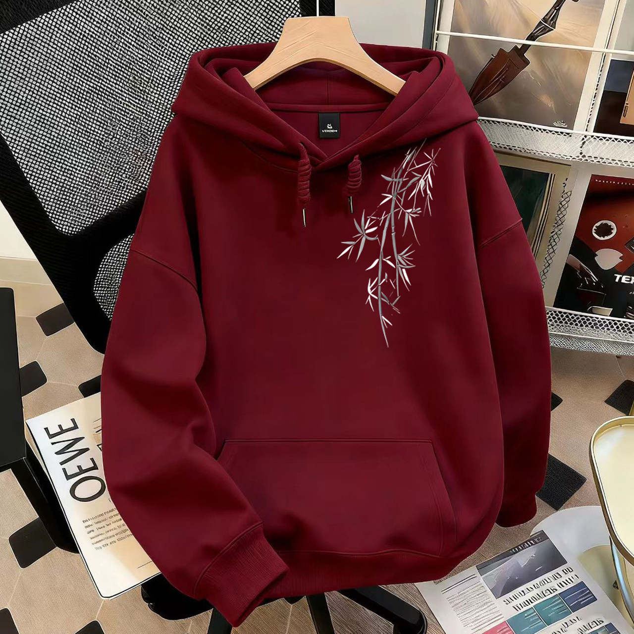 重磅国潮印花墨竹连帽卫衣男女秋冬加绒宽松百搭上衣新中式卫衣