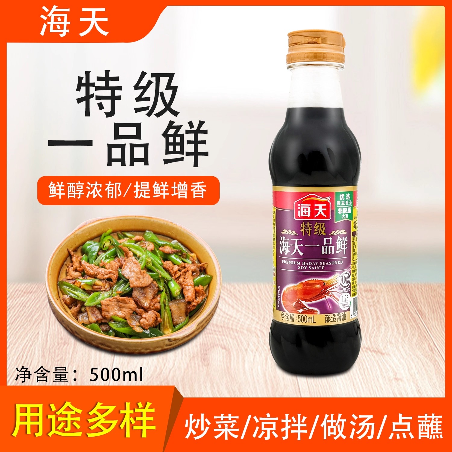 海天特级一品鲜500ml酿造酱油上色增鲜炒菜凉拌海鲜厨房调味品