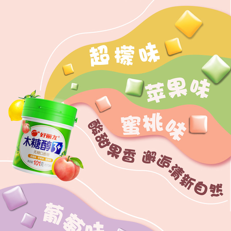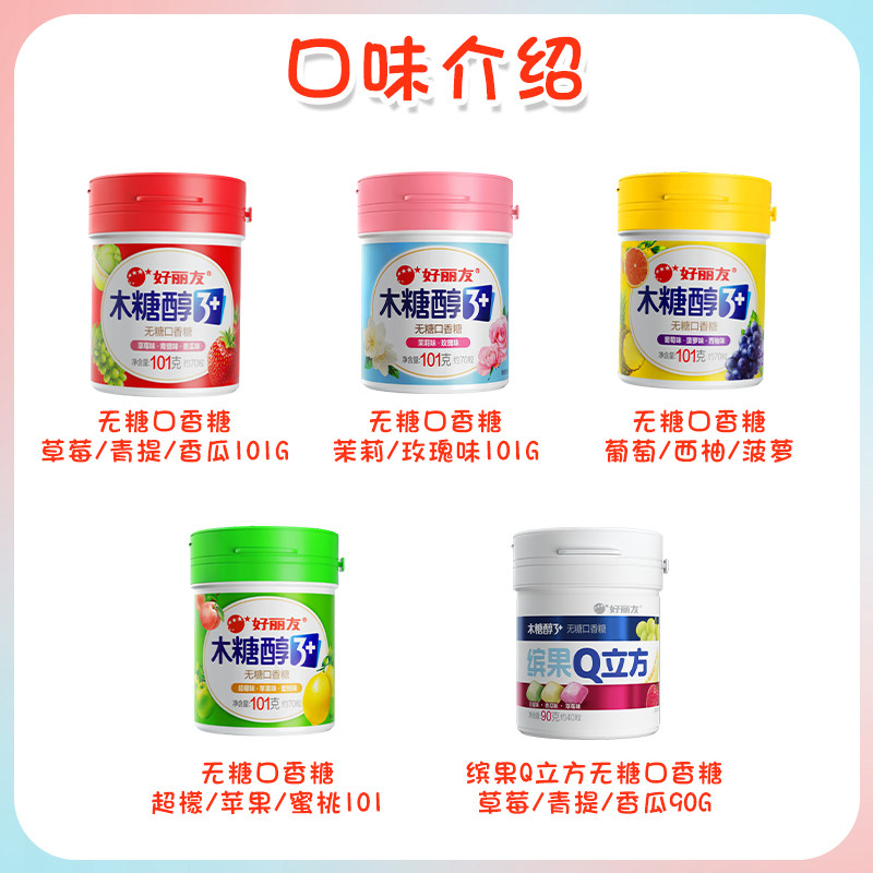 推荐理由:好丽友木糖醇无糖口香糖水果薄荷花香味清新口气大瓶装Q立方糖果
