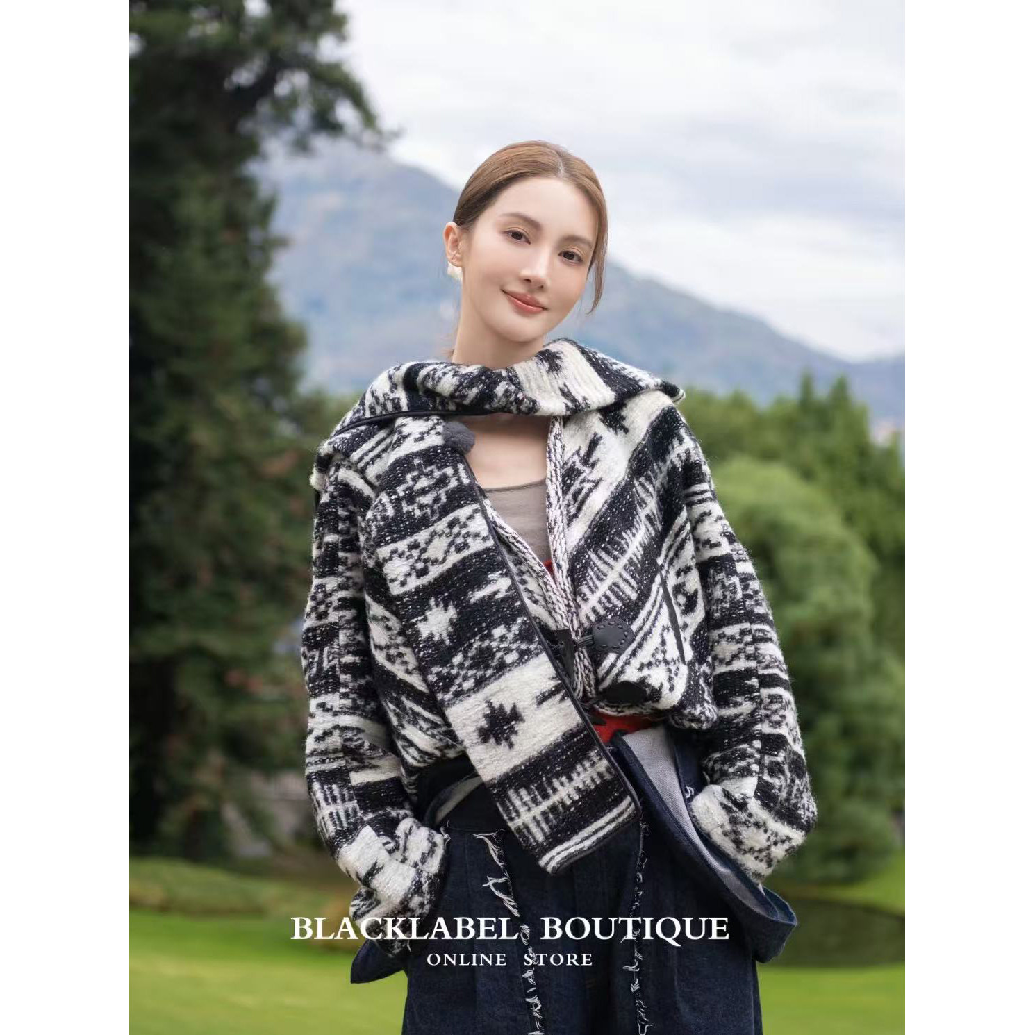 金晨同款 blacklabel 提花羊毛围巾领廓形短外套25秋冬新款开衫
