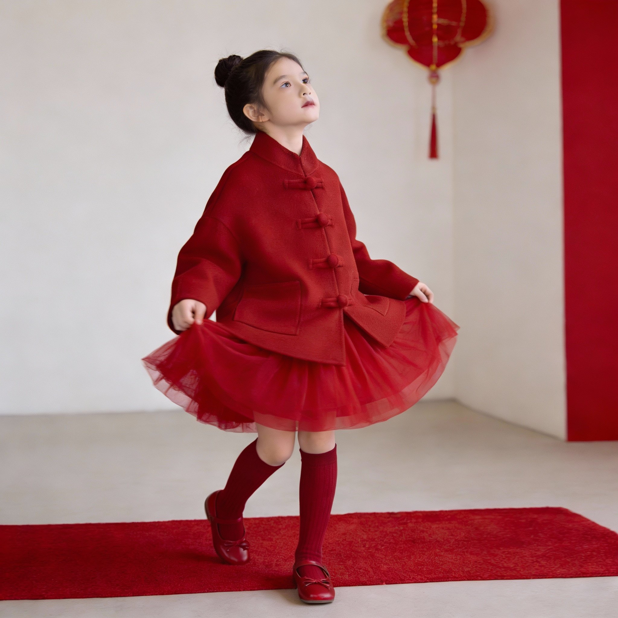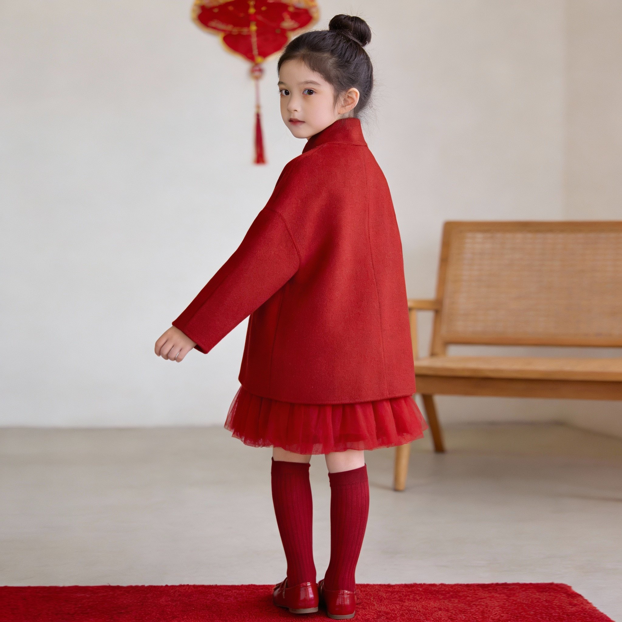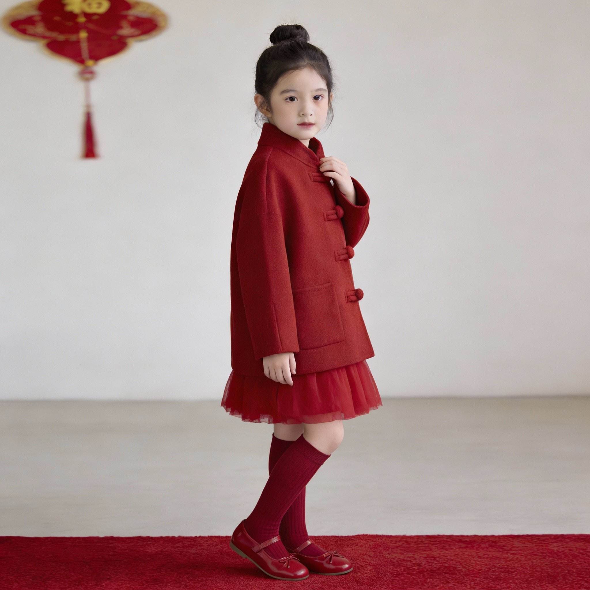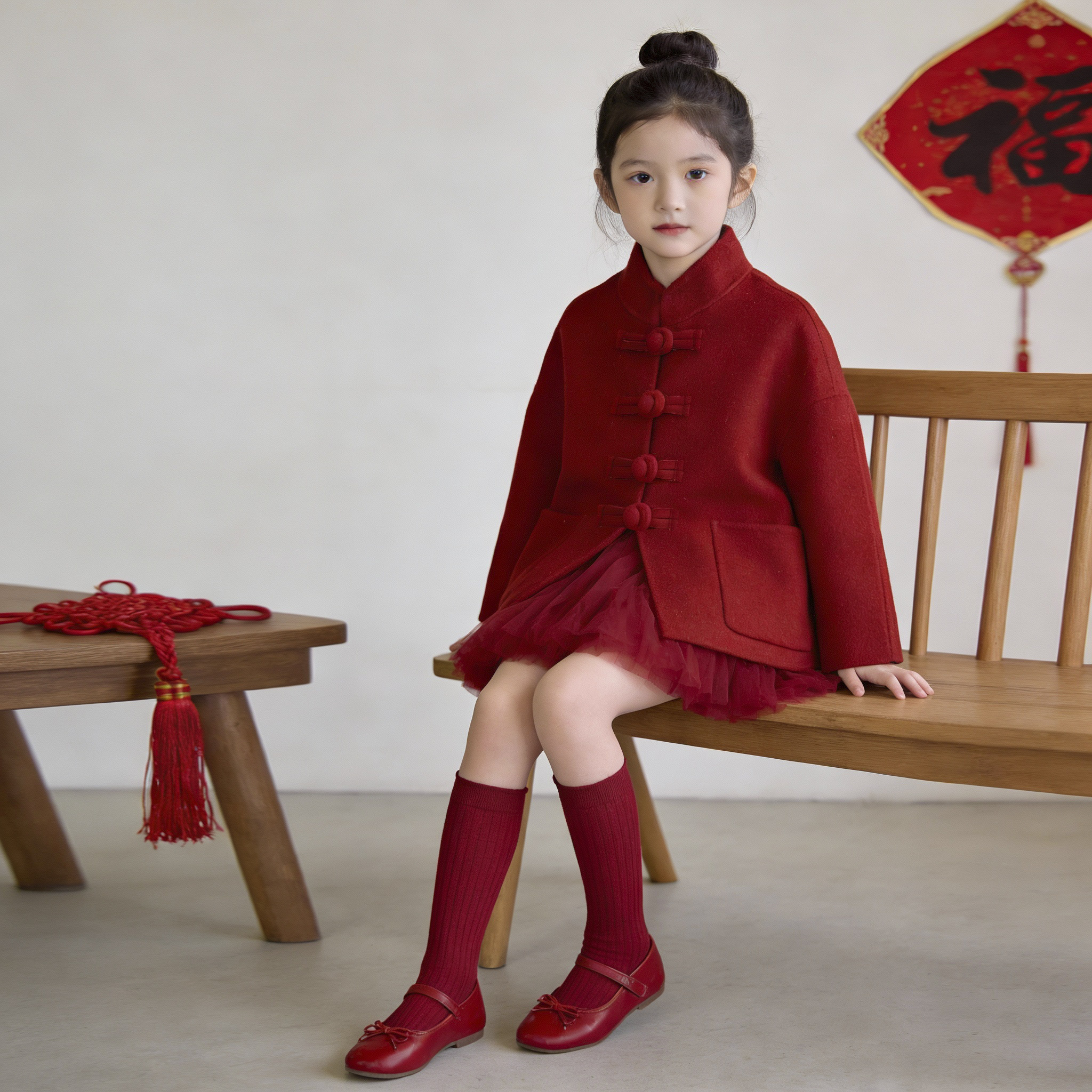儿童中国风盘扣双面羊绒外套秋冬新款加厚红色国潮年服女童呢大衣