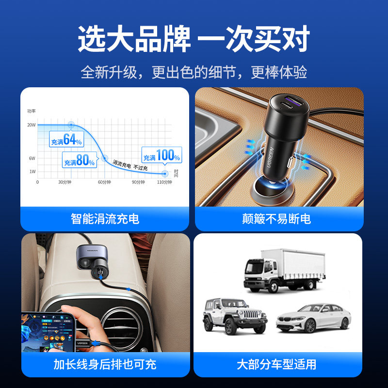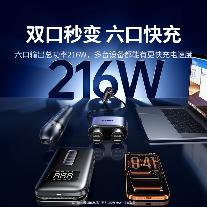 绿联车载充电器适用苹果17一拖二三点烟器快充扩展口转换插头usb