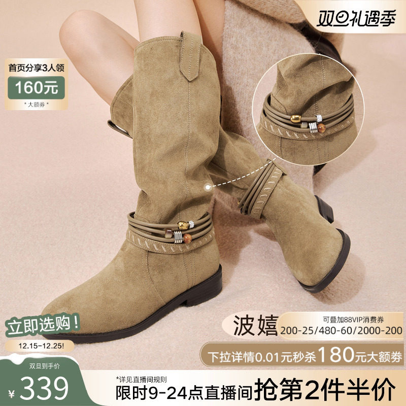 百思图2025冬新款堆堆靴西部靴大筒围复古女加绒高筒长靴W5862DG5