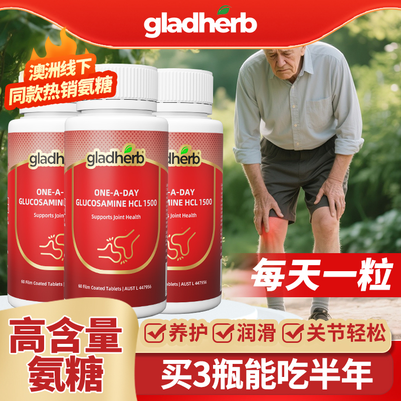 高含量GladHerb氨糖维骨力1500mg氨基葡萄糖关节养护进口正品官旗
