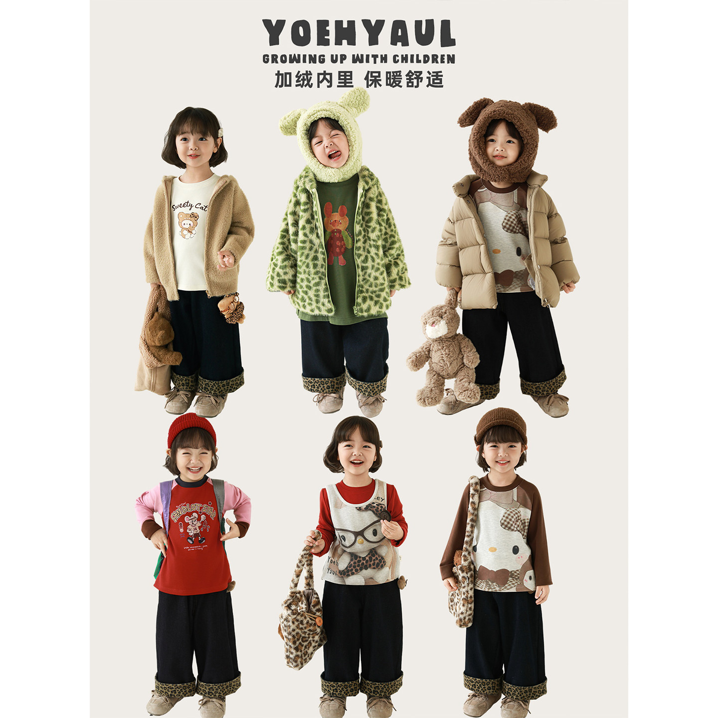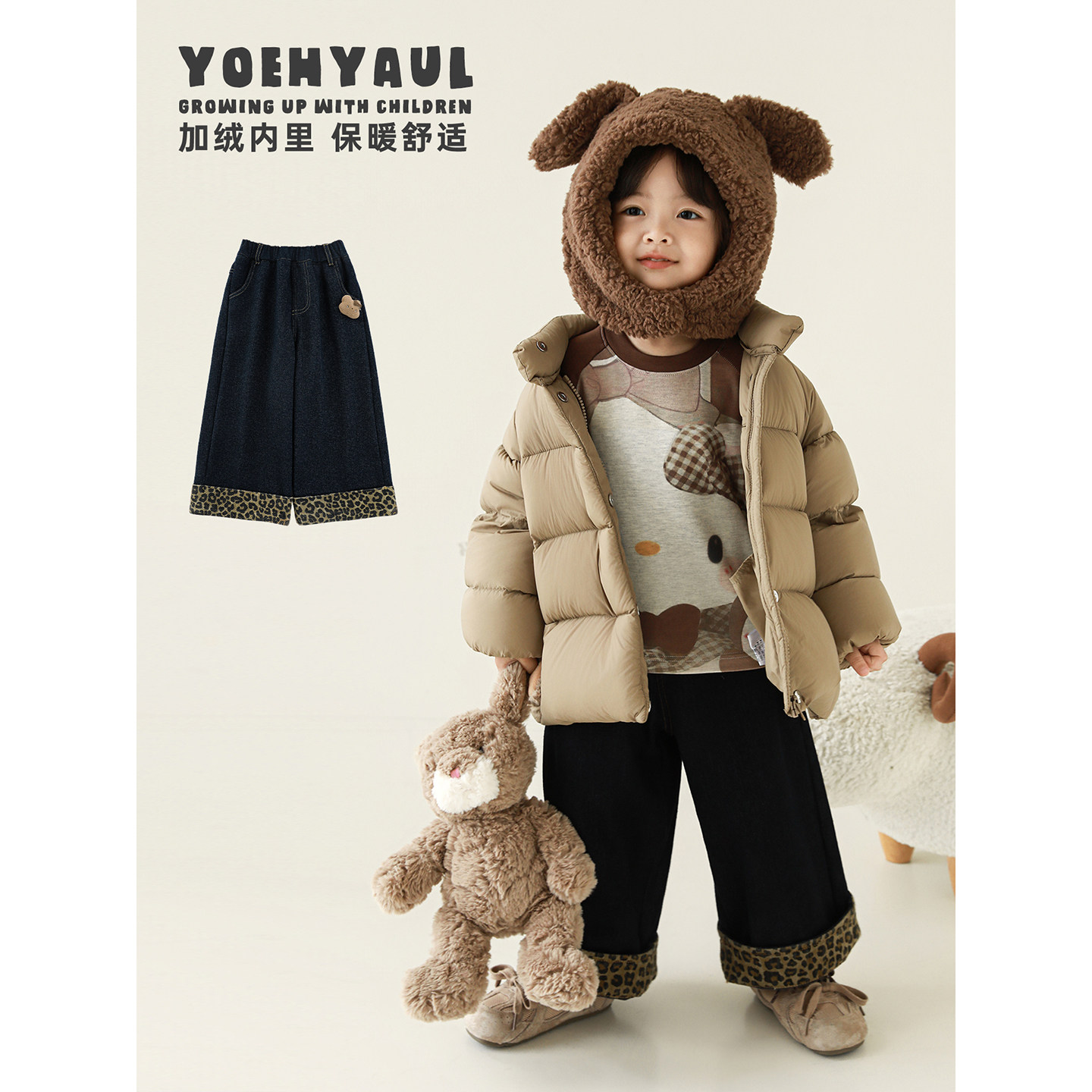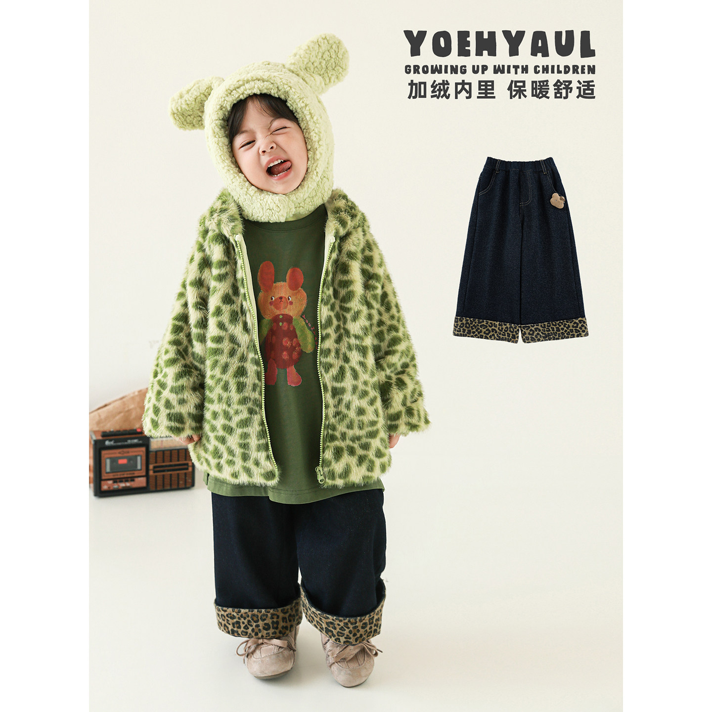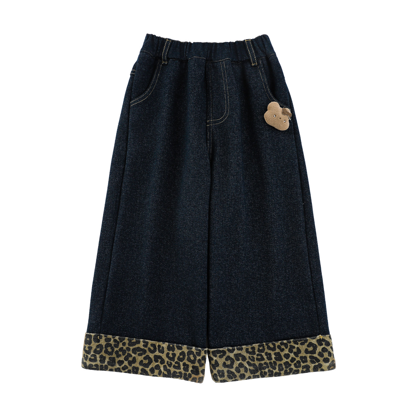 推荐理由:幼悠女童复古时髦豹纹拼接牛仔裤冬季童趣可爱猫咪玩偶显瘦直筒裤
