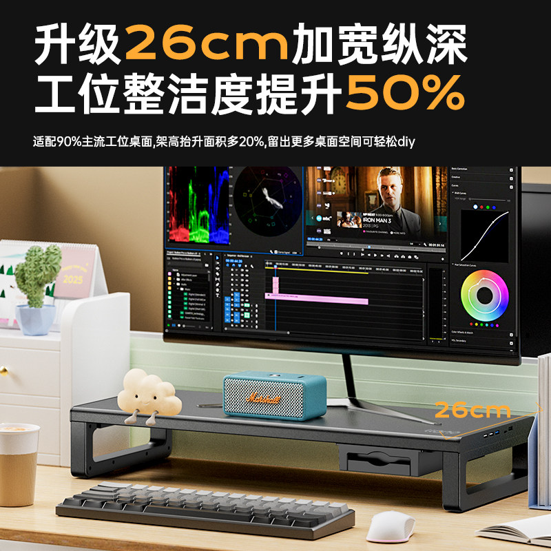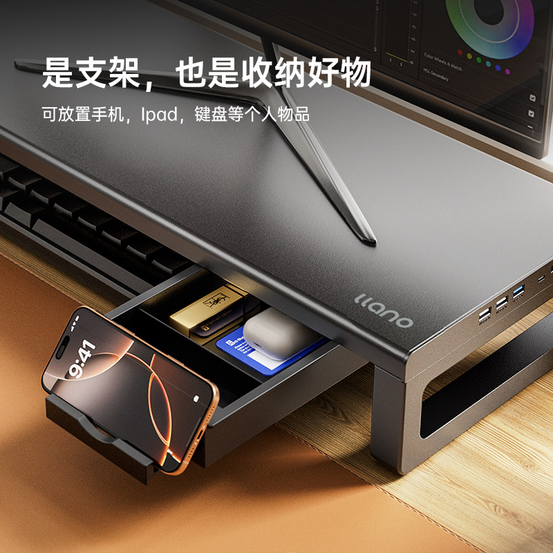 绿巨能电脑显示器增高架桌面金属台式工位带抽屉收纳USB办公底座电竞置物改造扩展