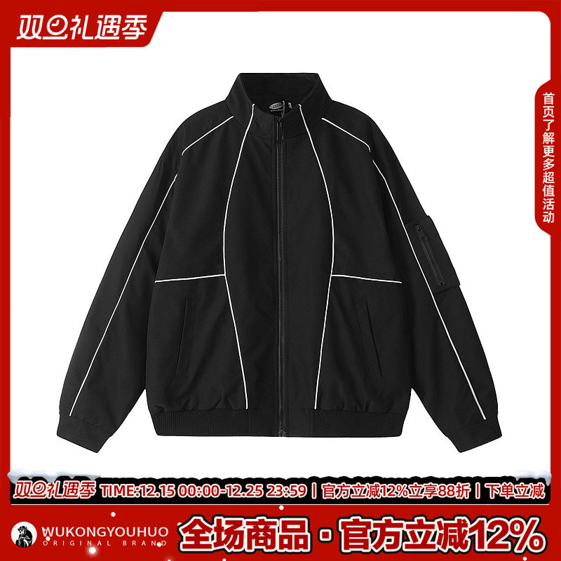 悟空有货美式高街棒球服夹克男反光条设计宽松运动潮牌冲锋衣外套
