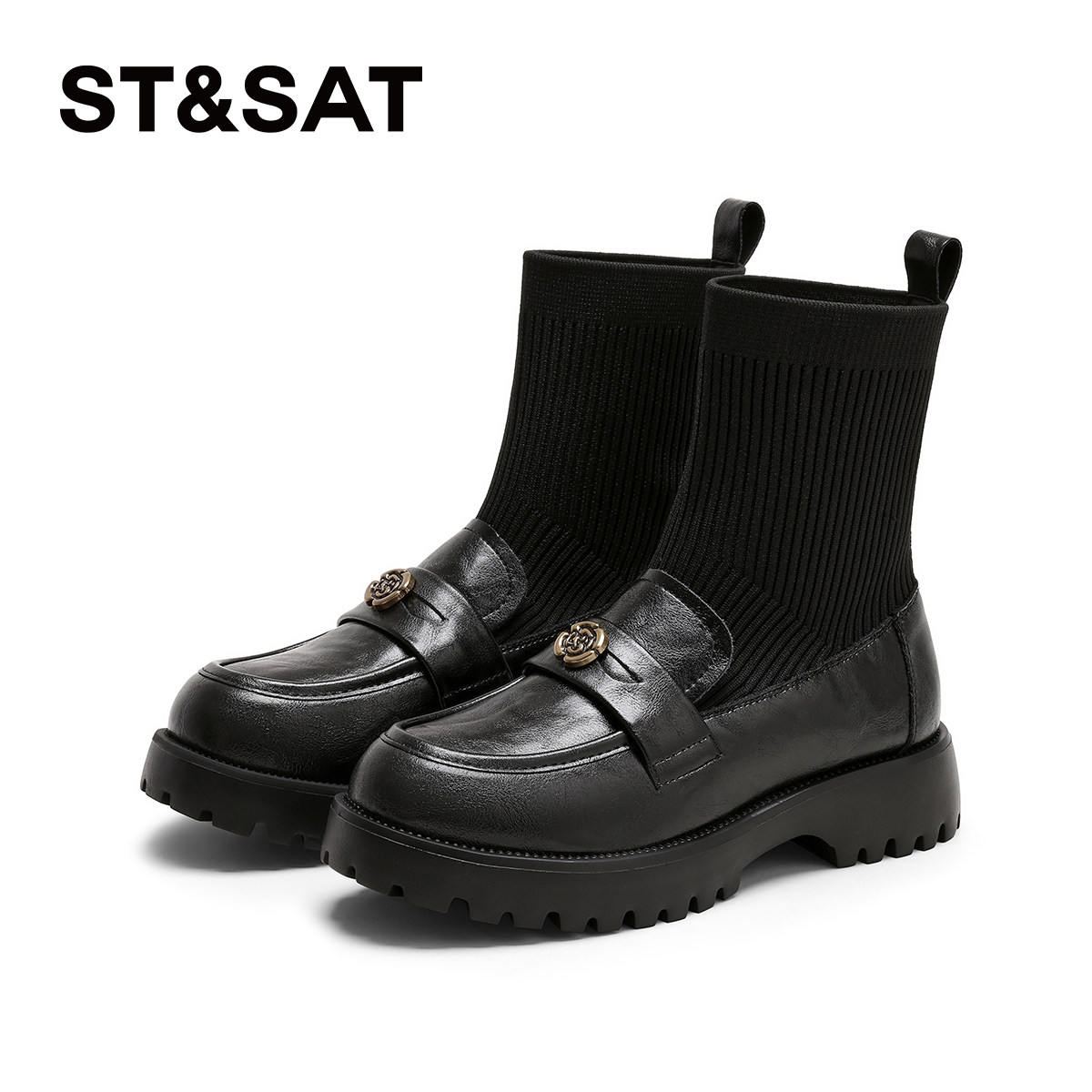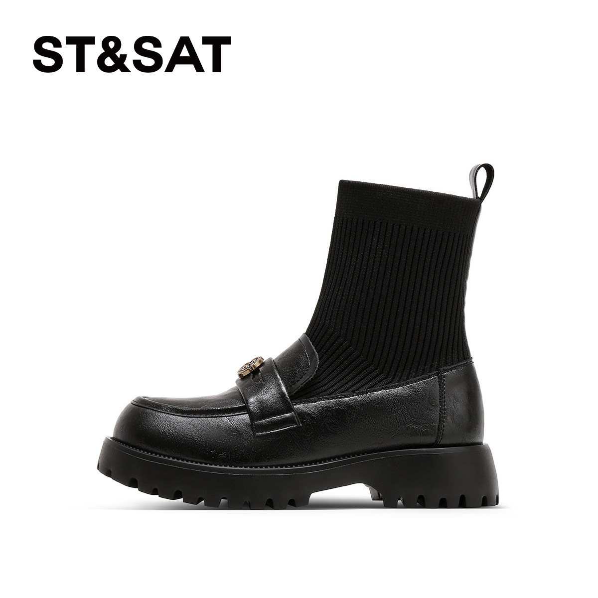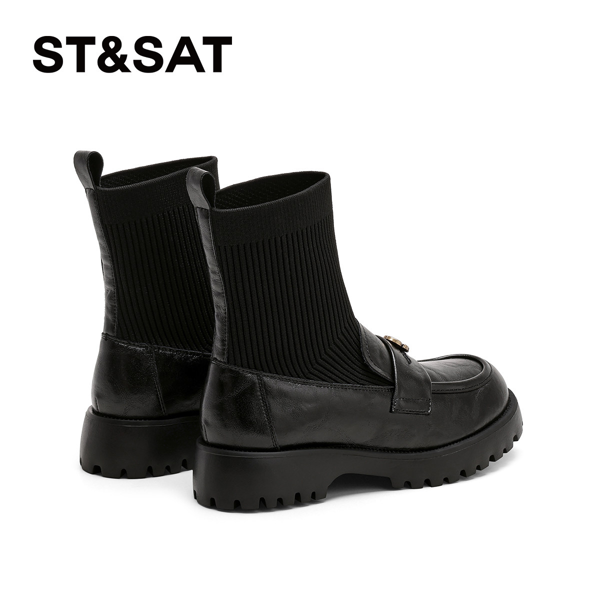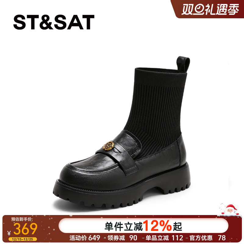 推荐理由:星期六乐福鞋袜靴女2025新款秋冬厚底加绒弹力瘦瘦靴黑色短筒女靴