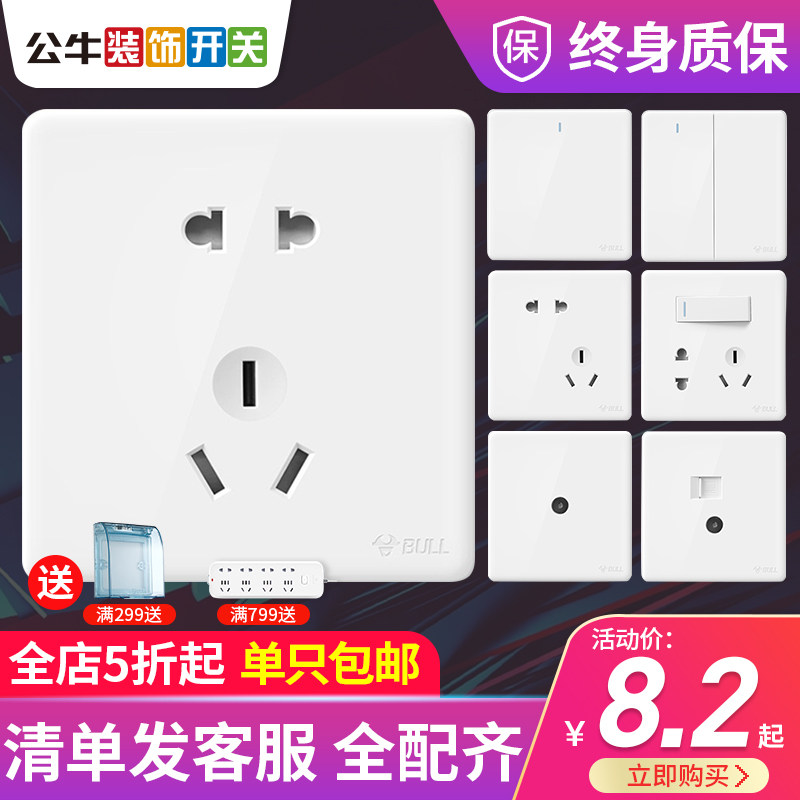 公牛装饰开关插座面板G28白五孔5孔86型暗装带usb电源套装家用