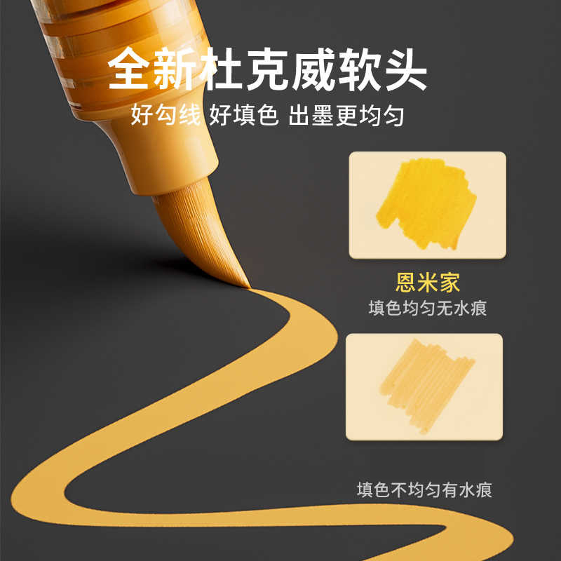 恩米直液式软头马克笔,覆盖力强,巨能画,智能直液控墨,一笔画出浓郁色彩,流动墨仓,不惧分层沉淀,多层分隔缓冲,水墨均匀放断色,上密下疏控压,匀量导墨放漏墨!