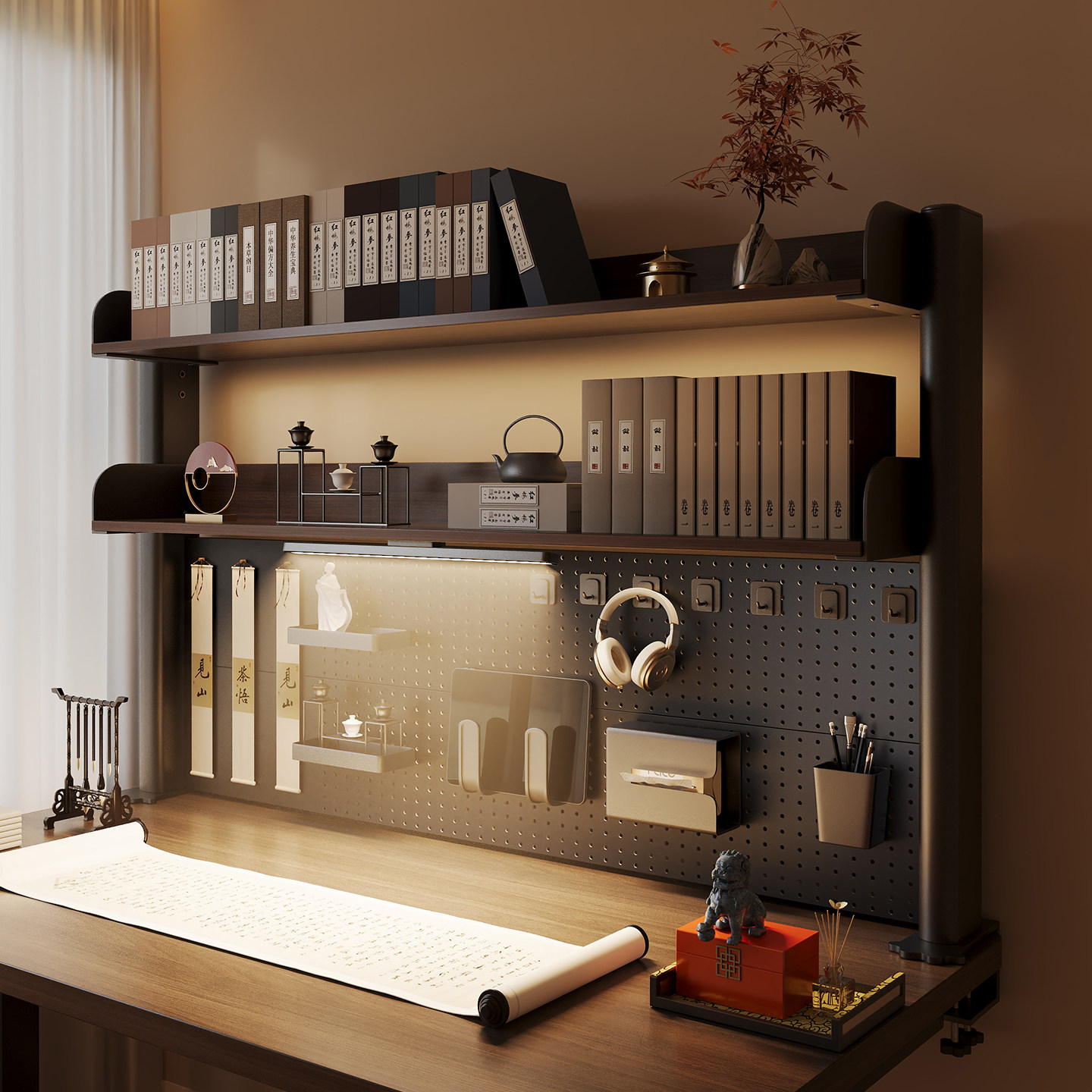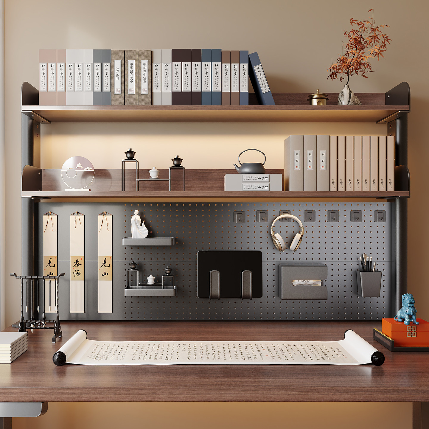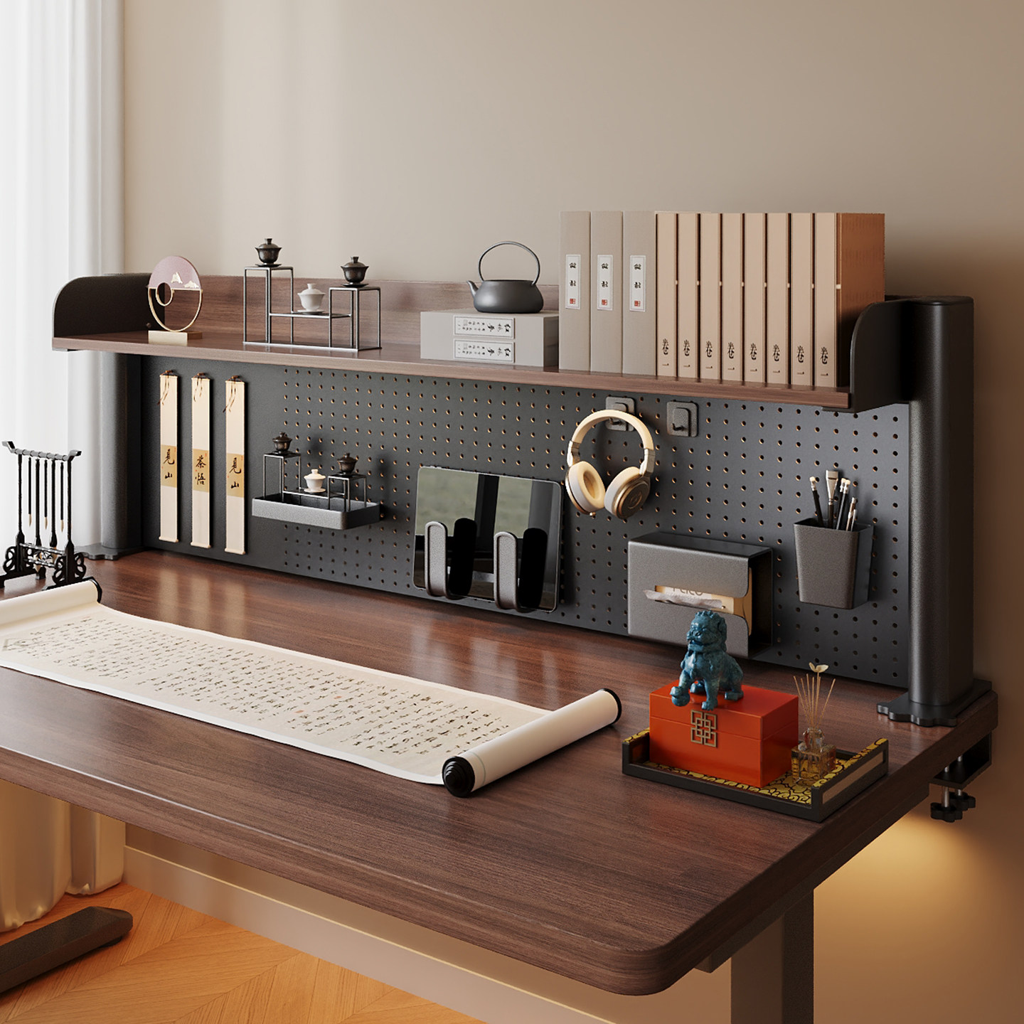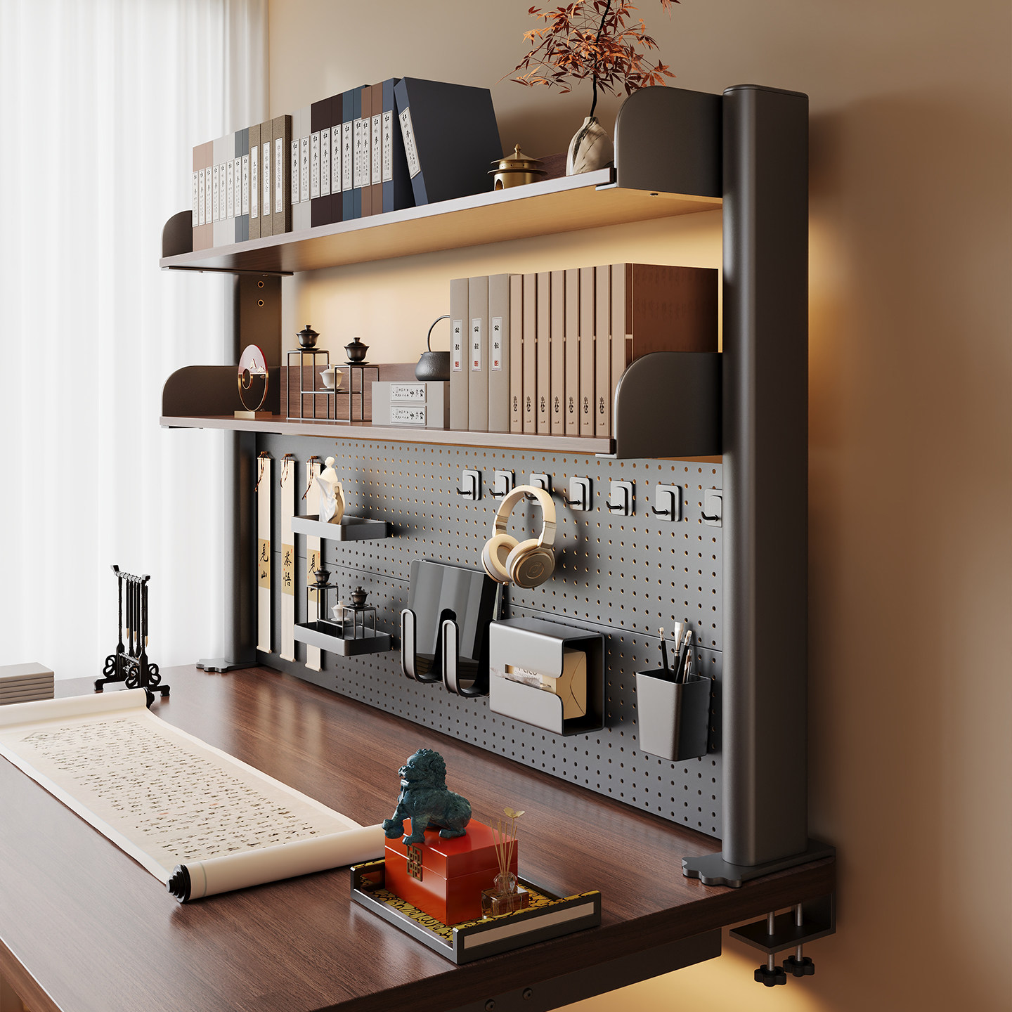 推荐理由:书架桌面洞洞板置物架中古学习办公书桌上方多层收纳架台面夹立式