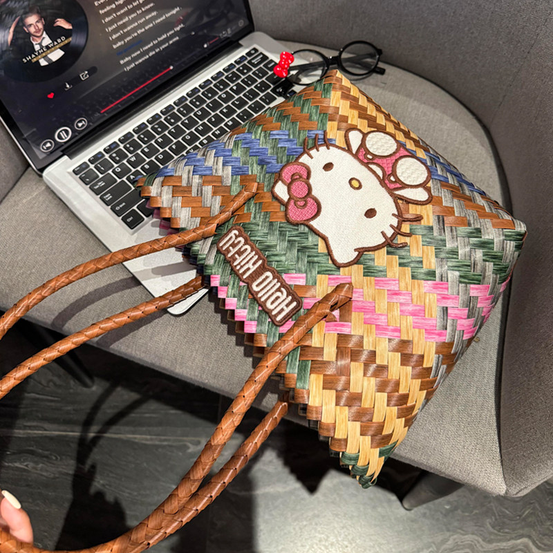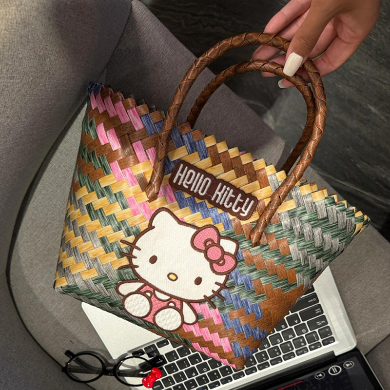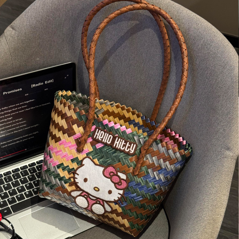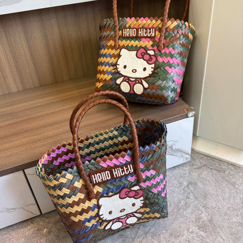 推荐理由:卡通仿藤编织菜篮子包KT猫野餐包手提单肩包大容量上班杂物小拎女