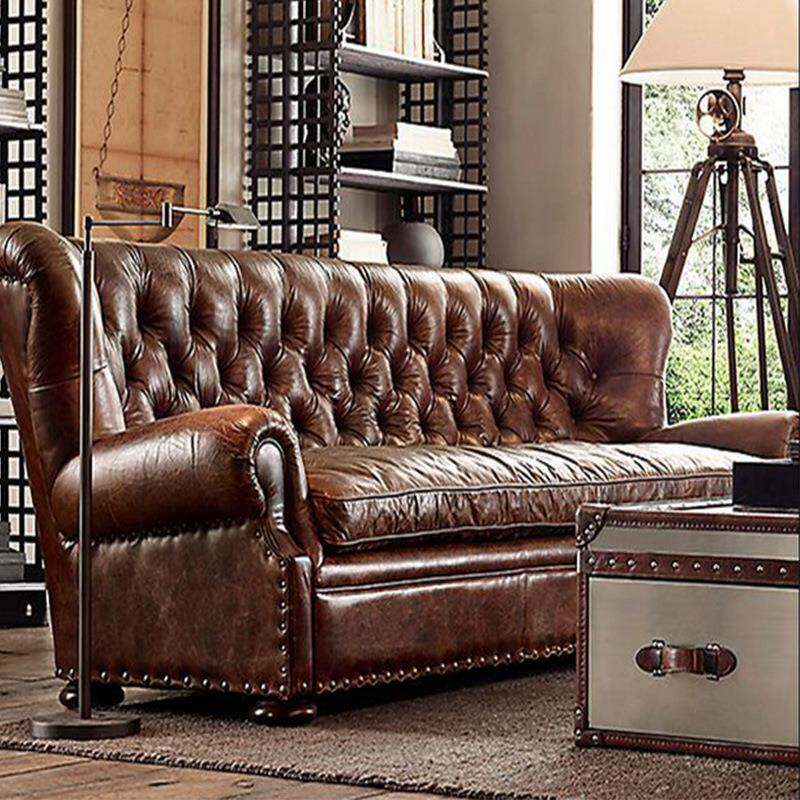 美式皮艺拉扣沙发双人三人位客厅高档复古做旧高靠背欧式皮沙发