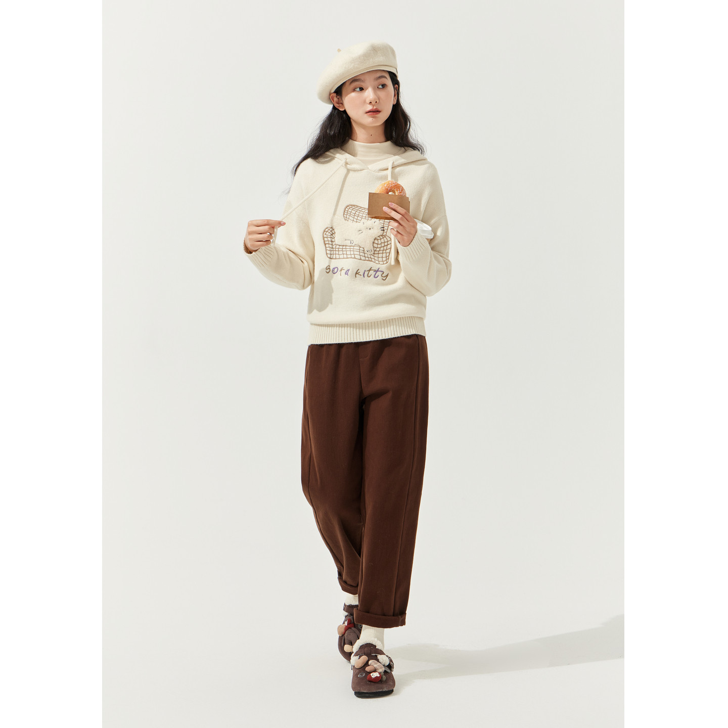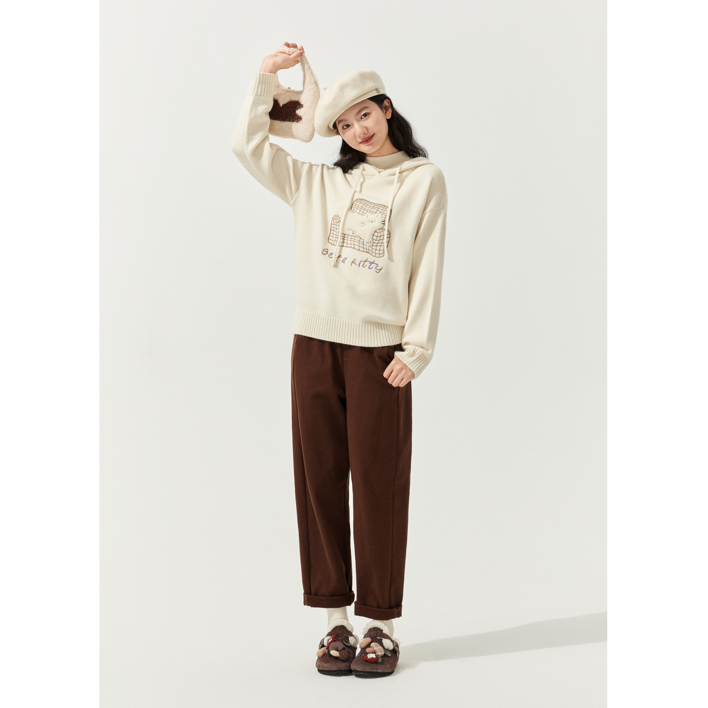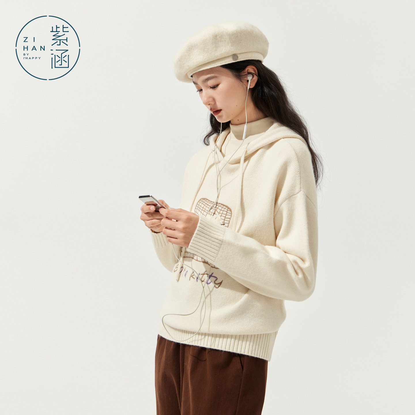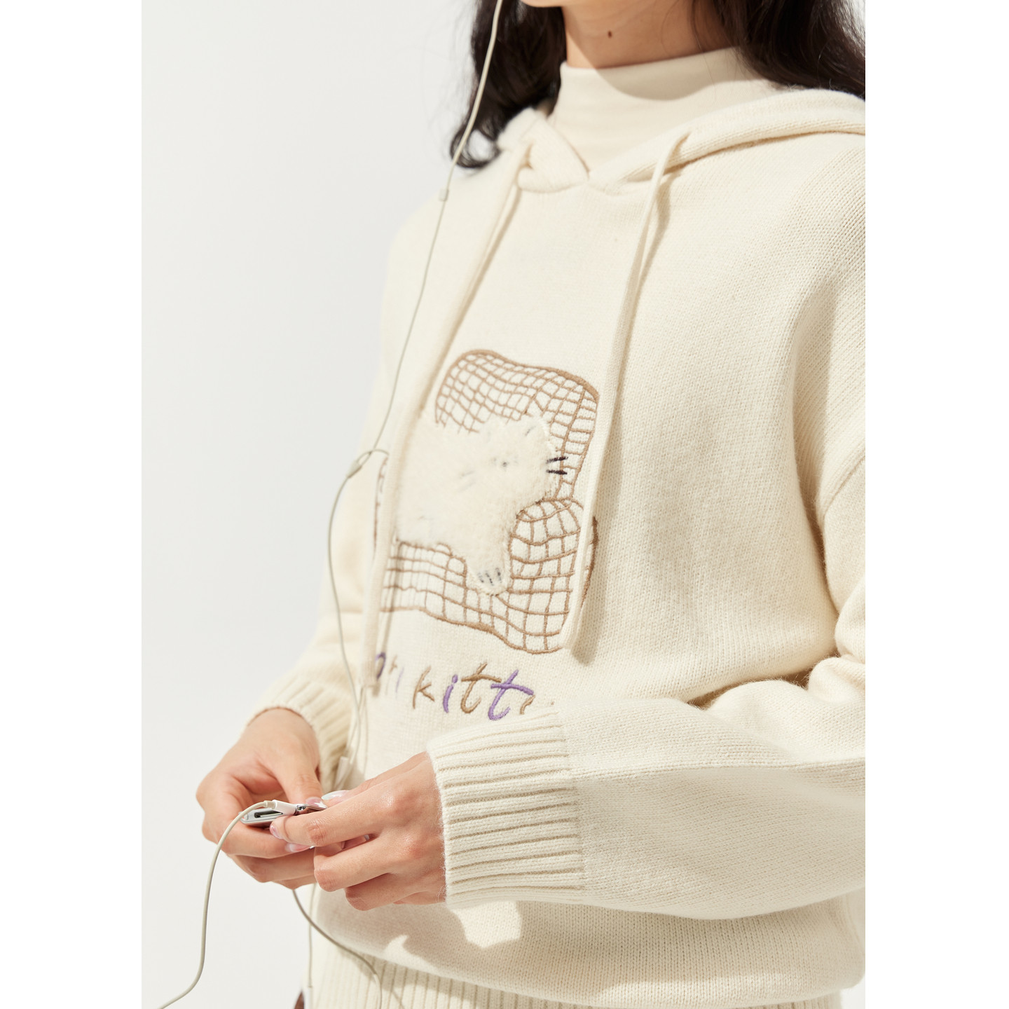 推荐理由:紫涵系绳连帽套头针织衫女2025冬季新款猫咪贴布刺绣宽松内搭毛衫