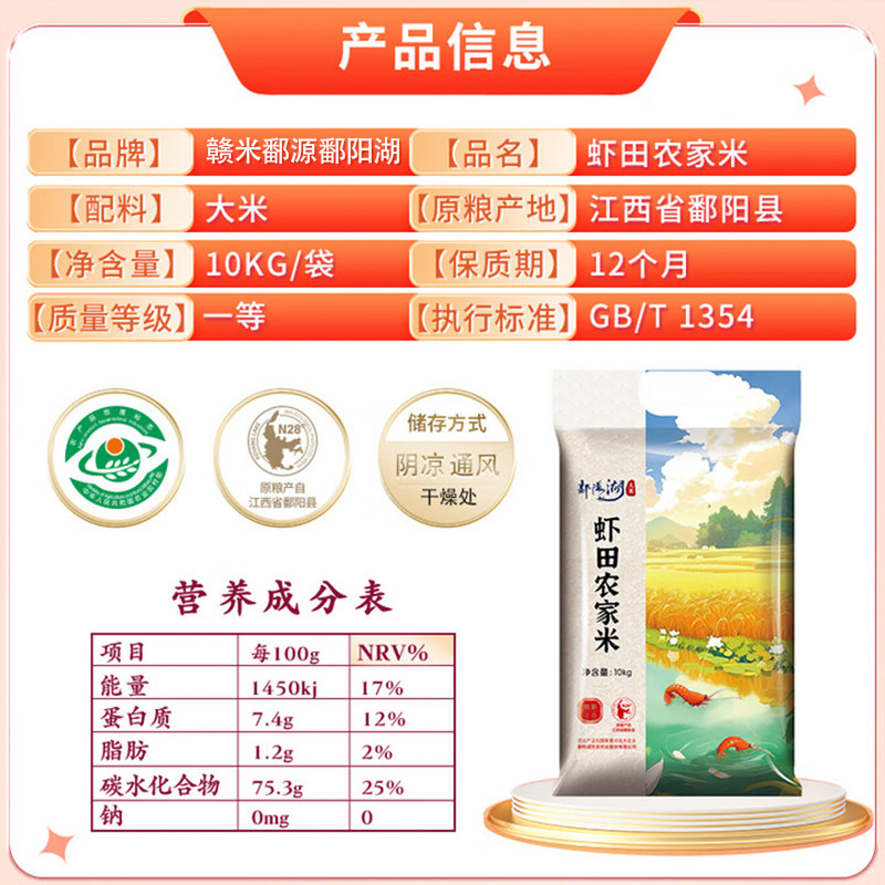 推荐理由:【低氧锁鲜非真空包装】鄱阳湖虾田农家米10kg装籼米南方香软米,官方立减9元,优惠卷20元,88vip9.5折,到手37.4元,可抵淘金币到手35元10kg大米,一斤仅需1.8块多