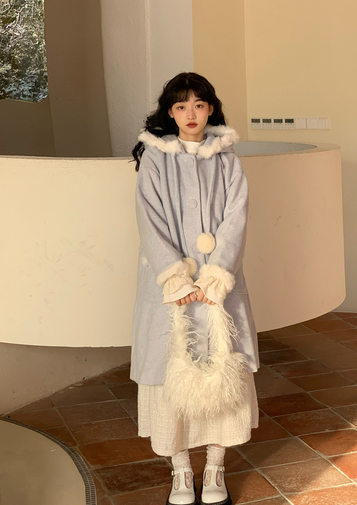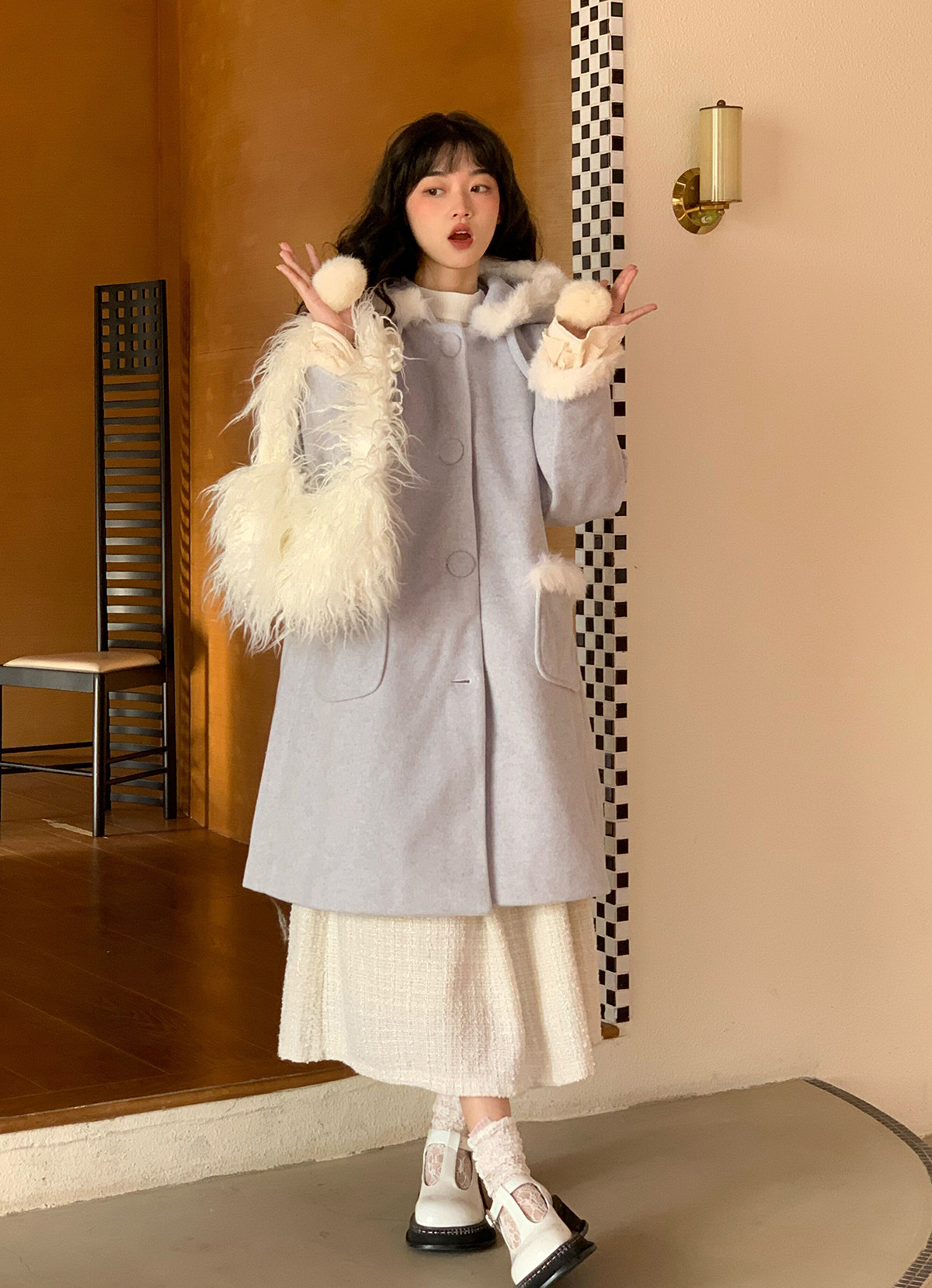蛋包饭餐厅【冬日集会】毛绒连帽呢子大衣女秋冬款小个子毛呢外套