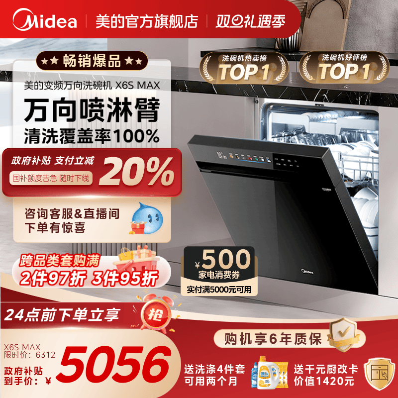 美的万向变频洗碗机家用全自动烘干消毒一体嵌入式18套X6SMax官方
