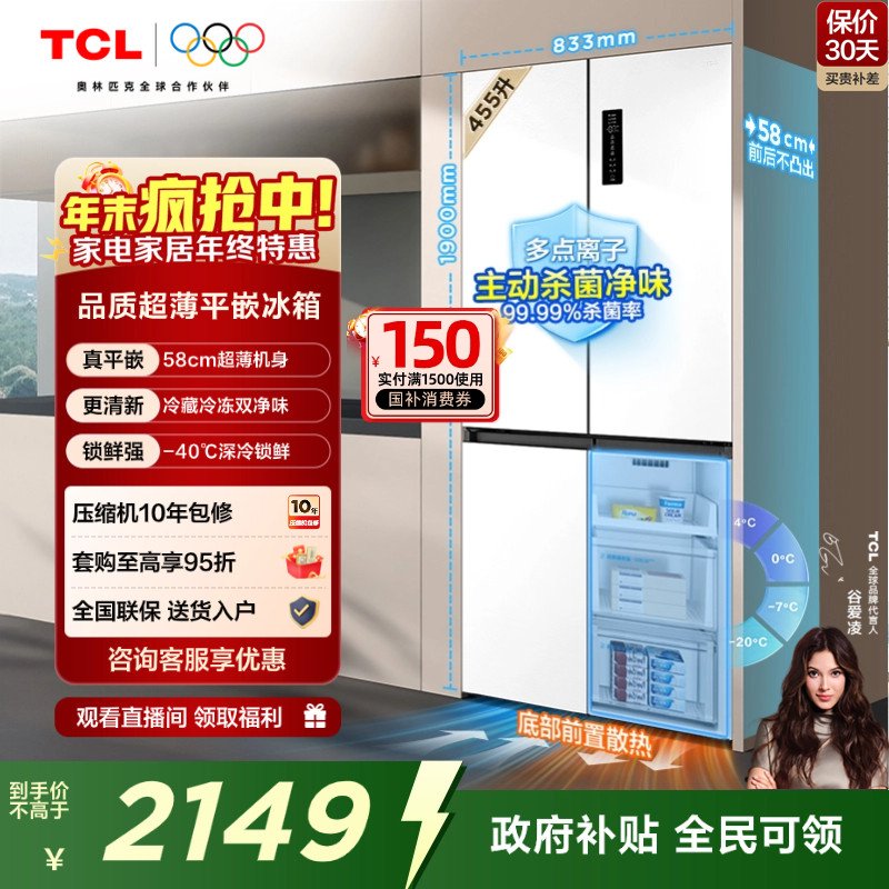 TCL大无界455升T9十字四开门电冰箱58cm超薄零嵌入式风冷无霜家用
