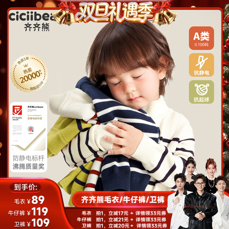 【香菇来了】齐齐熊男女童毛衣冬季儿童加厚宝宝衫针织衫加绒裤子