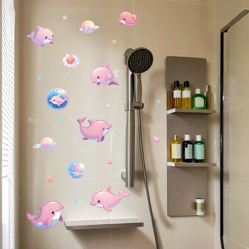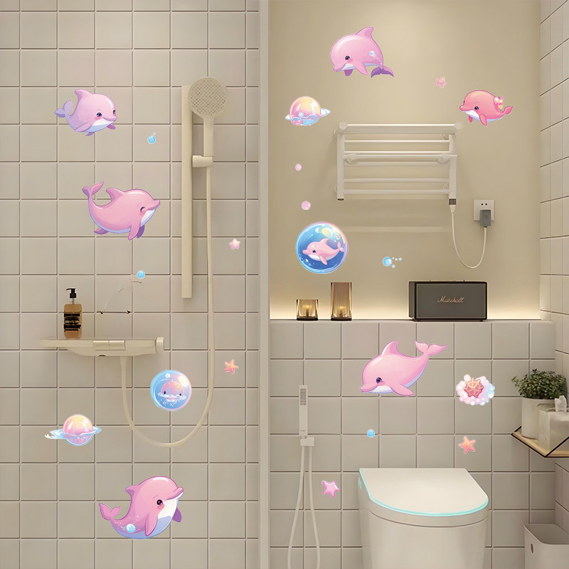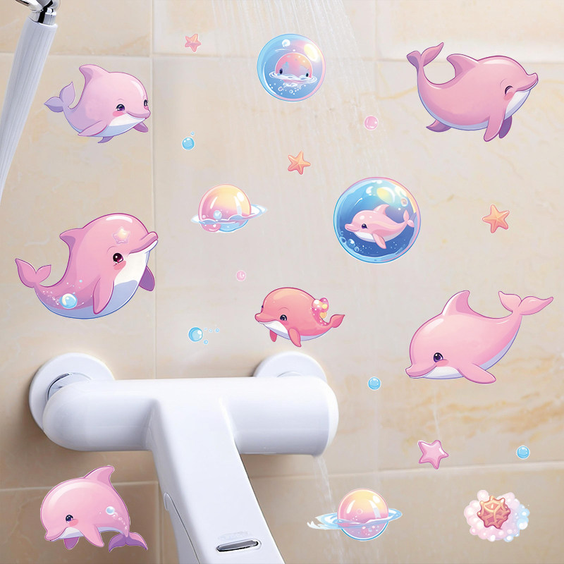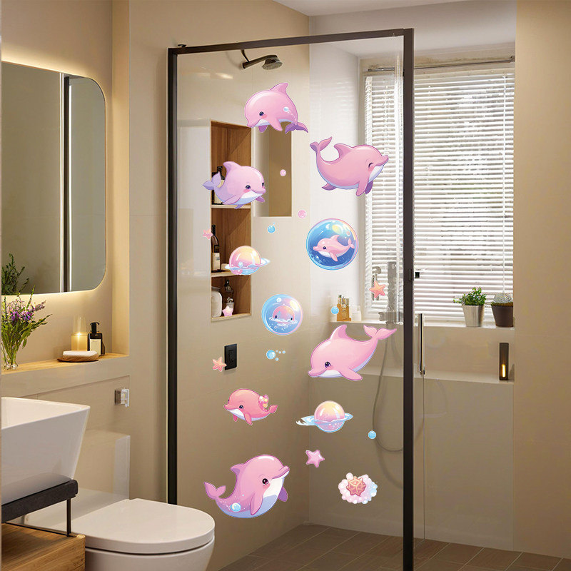 粉色海豚儿童卡通贴纸浴室出租屋车身美化防水自粘瓷砖玻璃墙贴