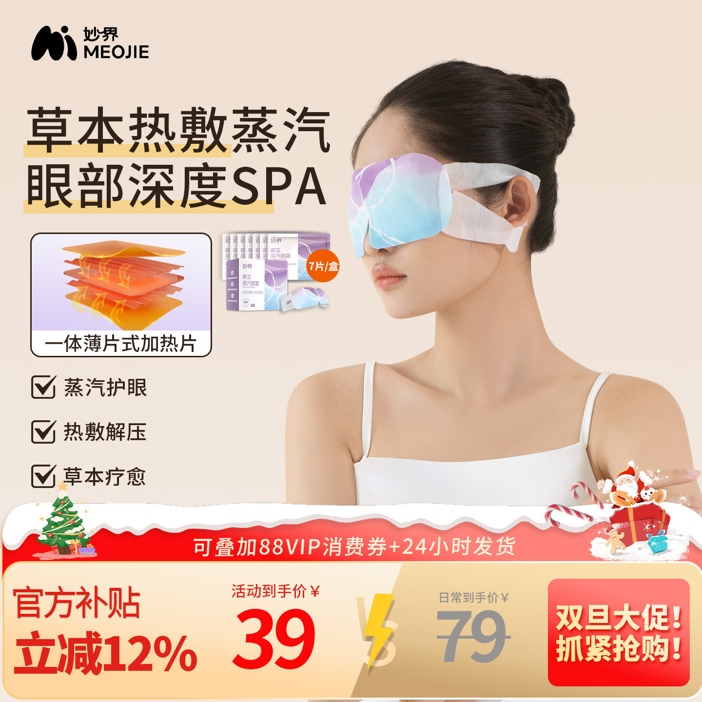 妙界蕲艾蒸汽眼罩热敷发热缓解眼疲劳遮光润眼睡眠眼贴薰衣草香