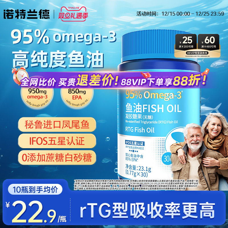 诺特兰德高纯度95%Omega-3鱼油无糖型成人中老年人RTG型软胶囊