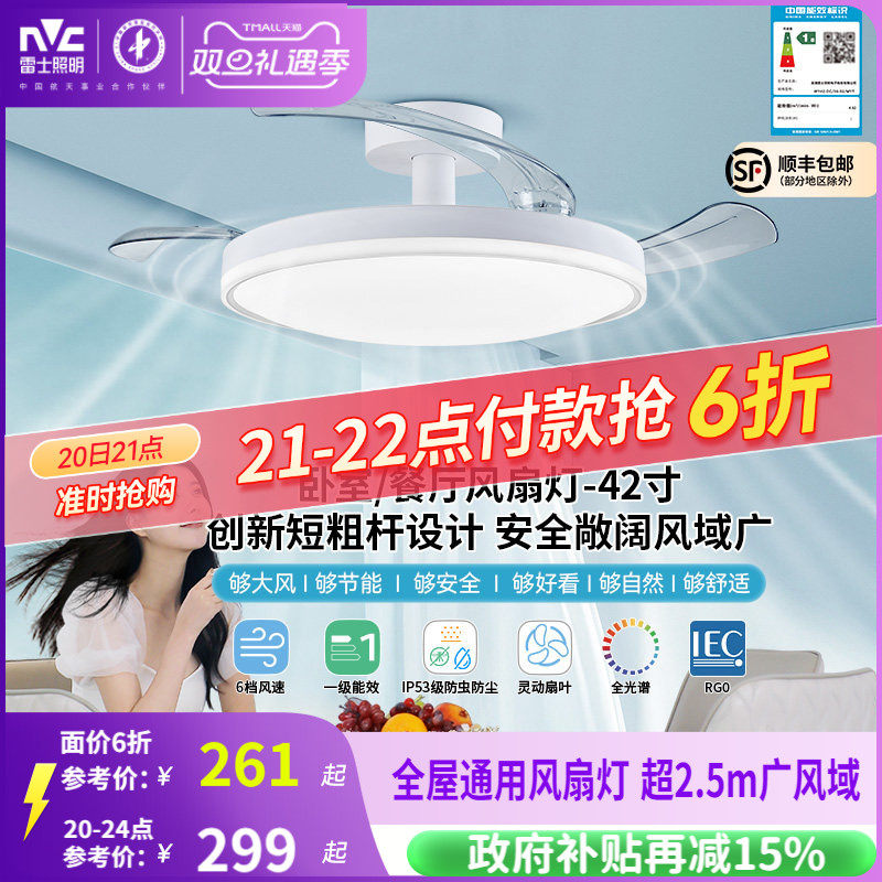 雷士照明风扇灯客厅餐厅卧室灯吊扇灯家用吊灯简约电扇枕边风灯具