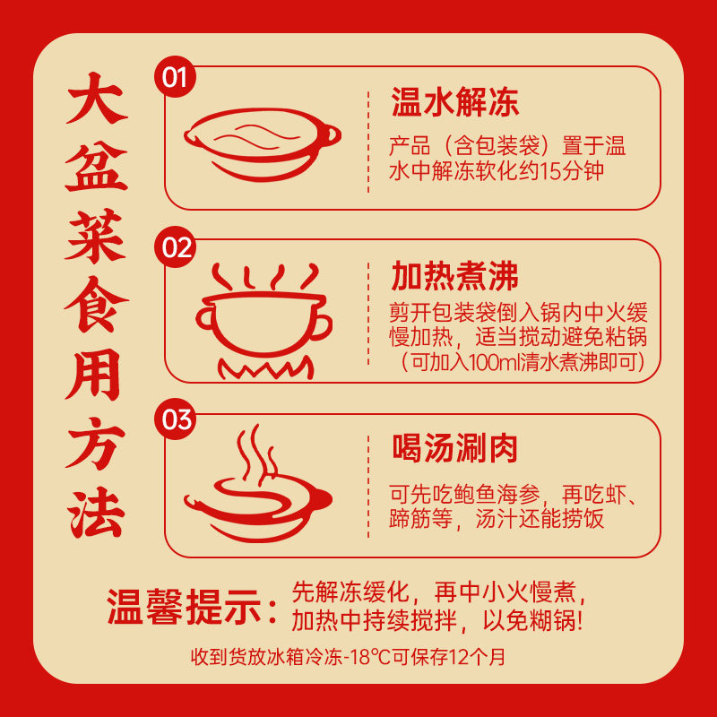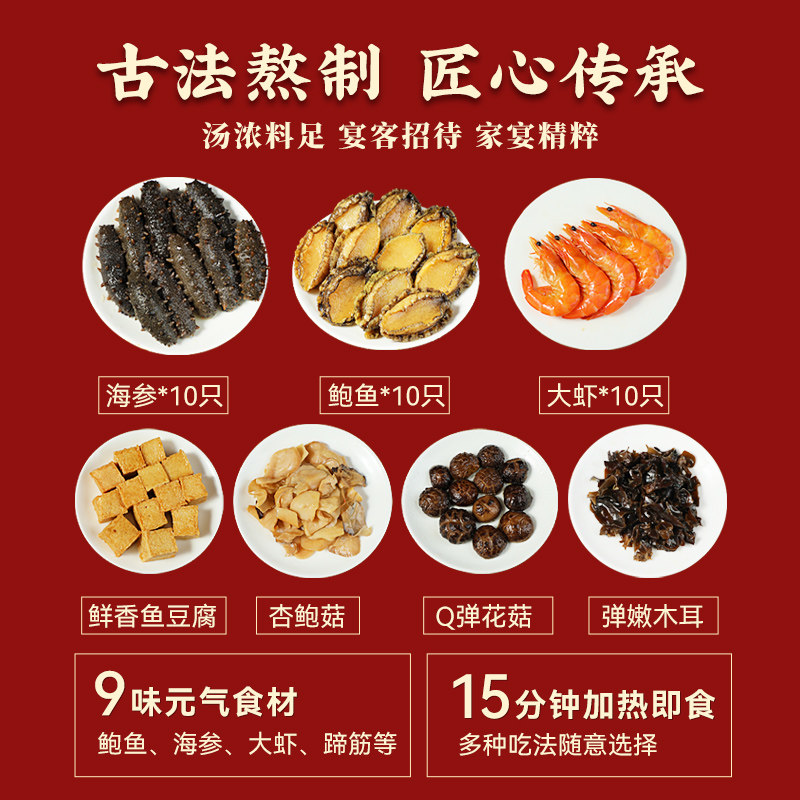 推荐理由:大盆菜加热即食金汤鲍参佛跳墙十参十鲍十虾海鲜礼包年夜饭预制菜